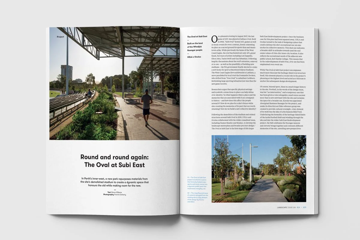 The issue features OCULUS Senior Landscape Architect Virginia Overell’s review of Richmond High School designed by SBLA Studio, and Simon Kilbane’s review of The Oval at Subi East, designed by OCULUS and UDLA: