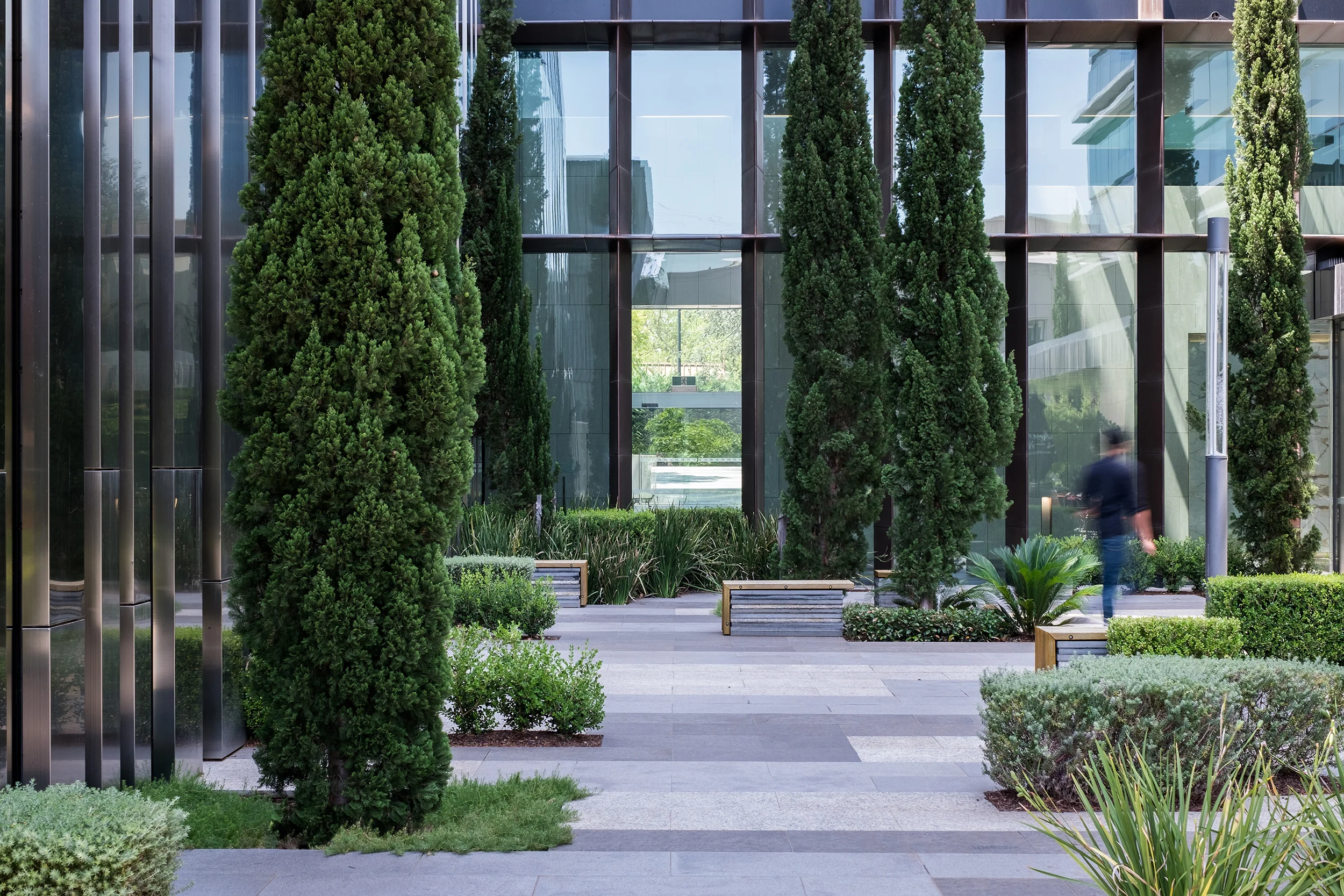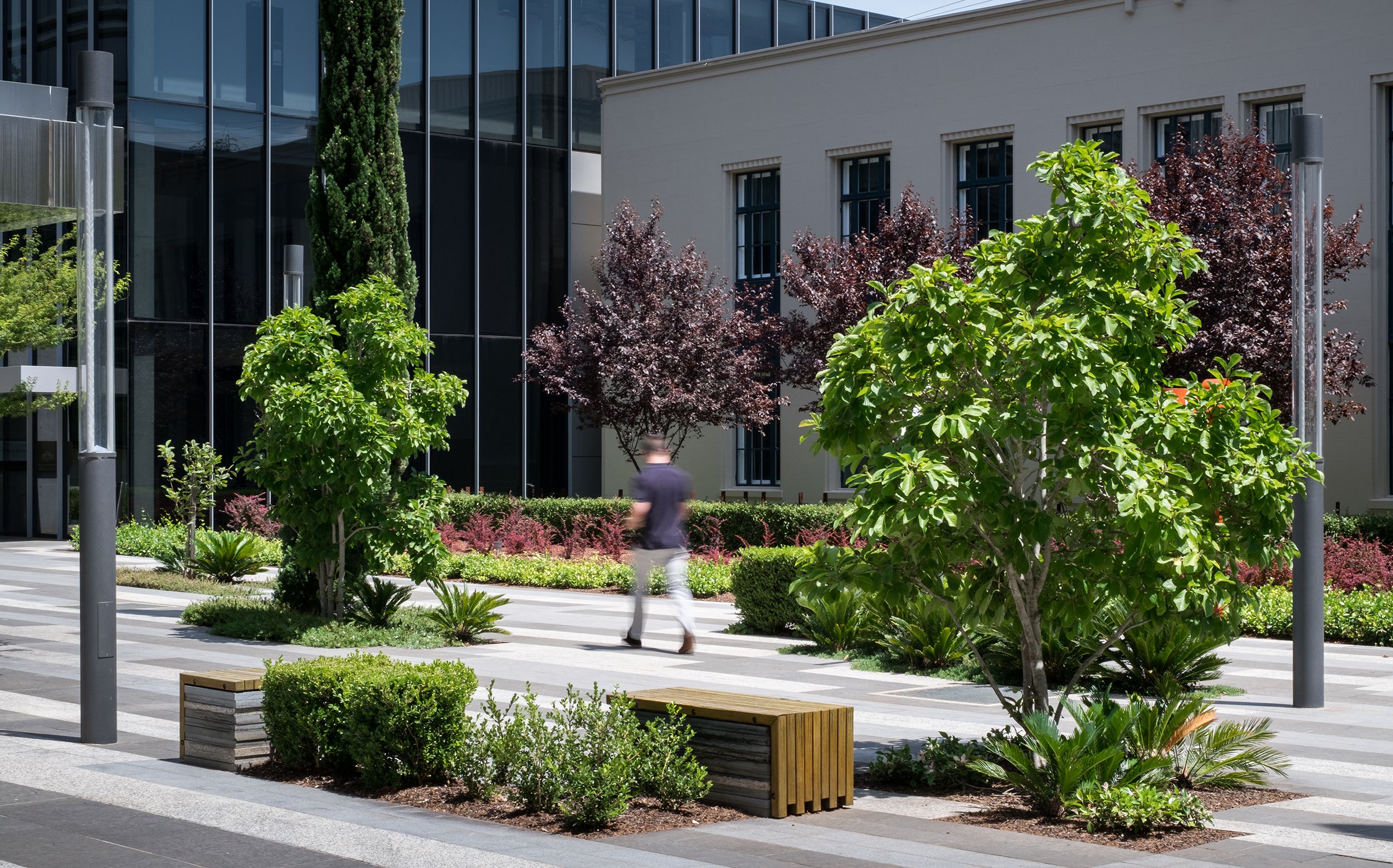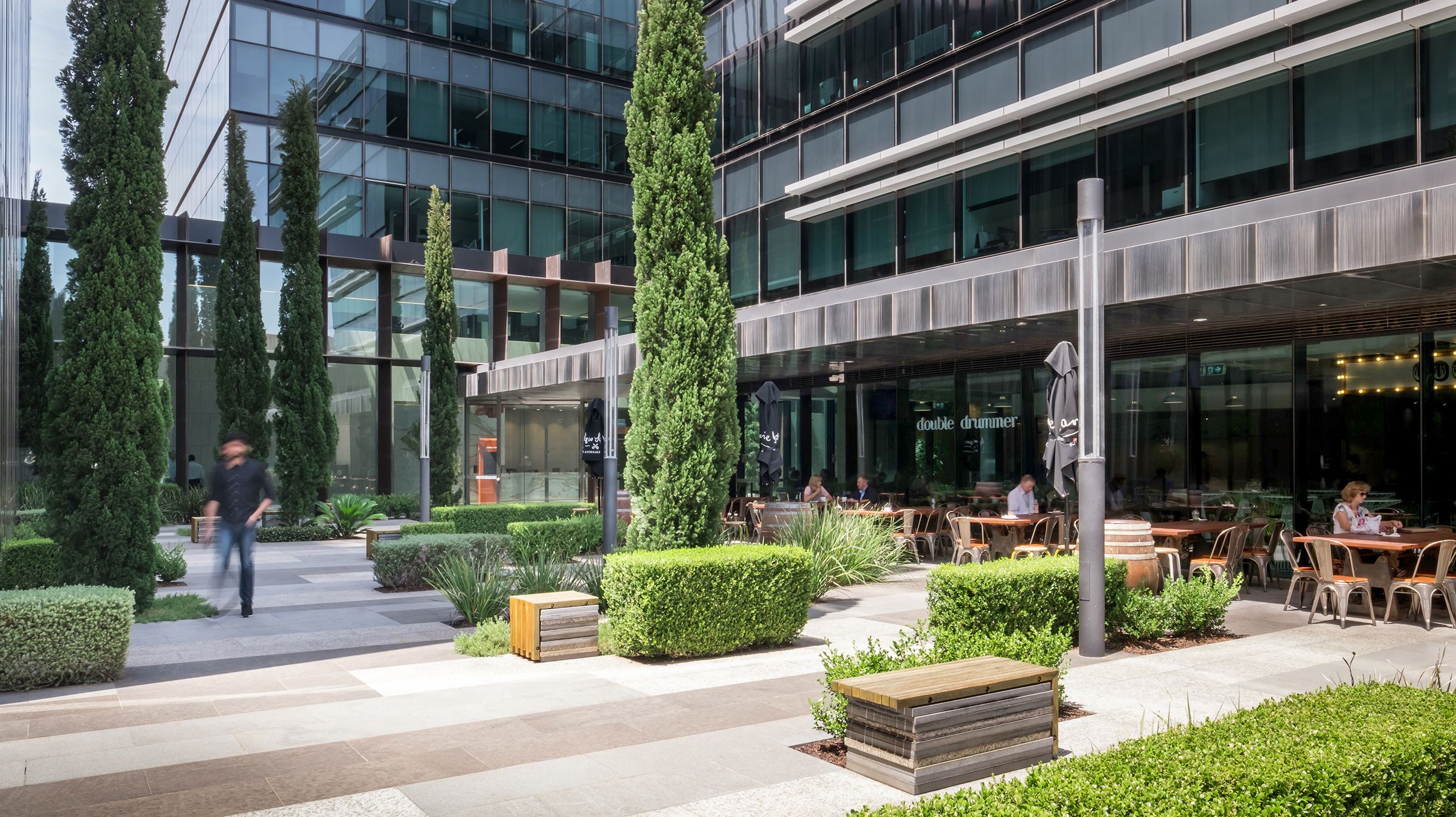 Central to the design is a large landscaped plaza that is activated by ground floor retail and building lobby entrances. The plaza provides for outdoor seating for office workers to eat lunch or have a coffee in as well as an alternative location to hold informal meetings. The paving pattern consists of a matrix of different granites, punctuated by tall conifers trees at scale with the buildings and low groundcover planting and hedges.