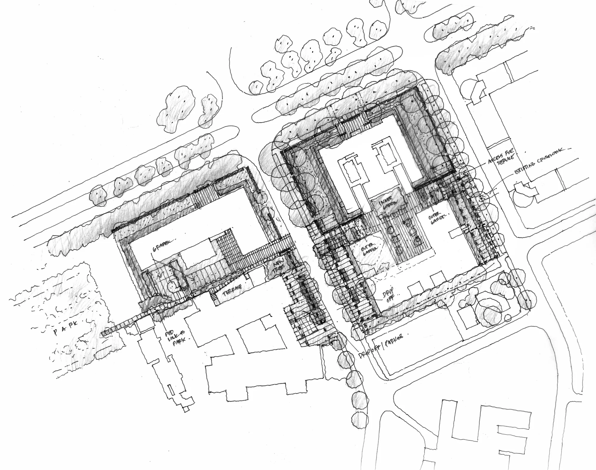 A ceremonial drop-off is located off Kings Avenue, with the main vehicular set down area paved as a pedestrian priority space.