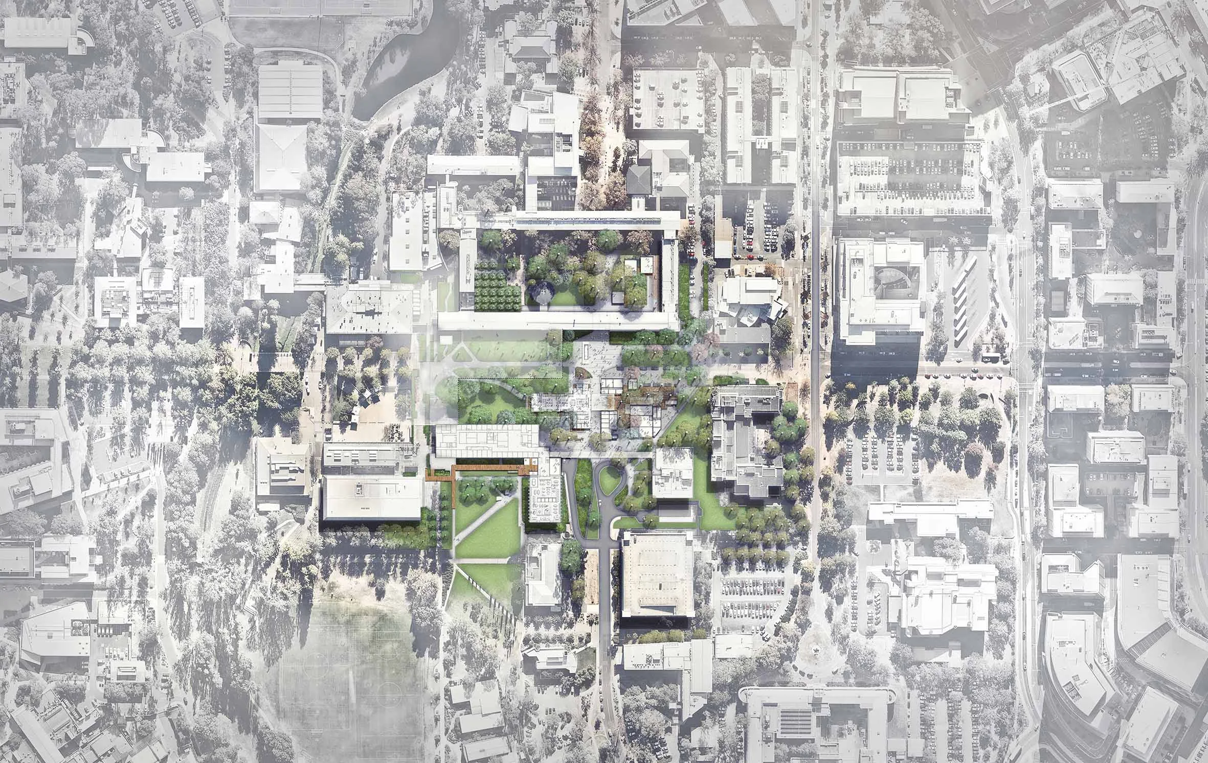 An ensemble of new and adapted spaces that served as a temporary heart of the Australian National University’s Canberra campus for 18 months.