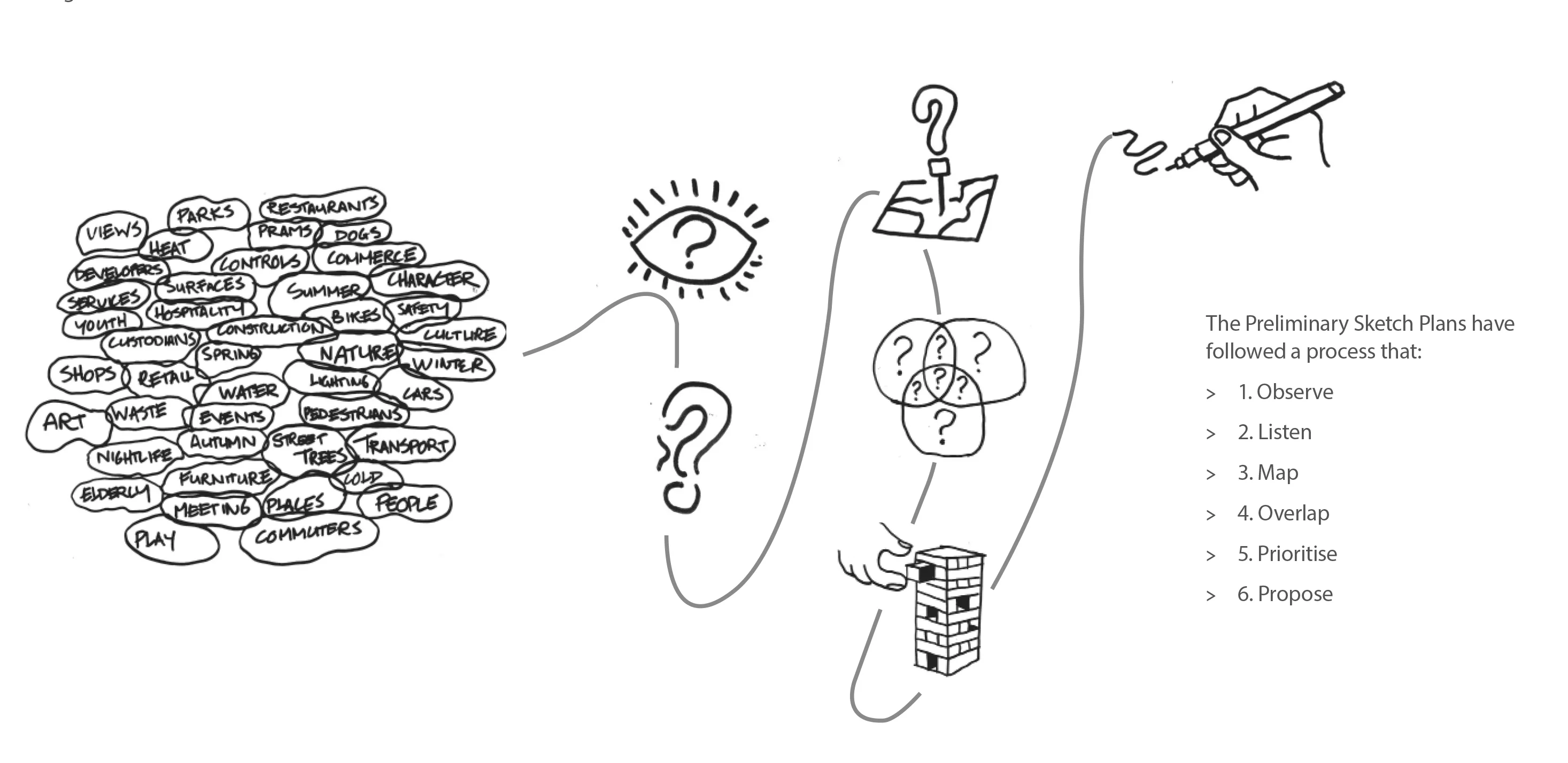 The design strategies focused on physically locating and prioritising ambitions brought out through community consultation.