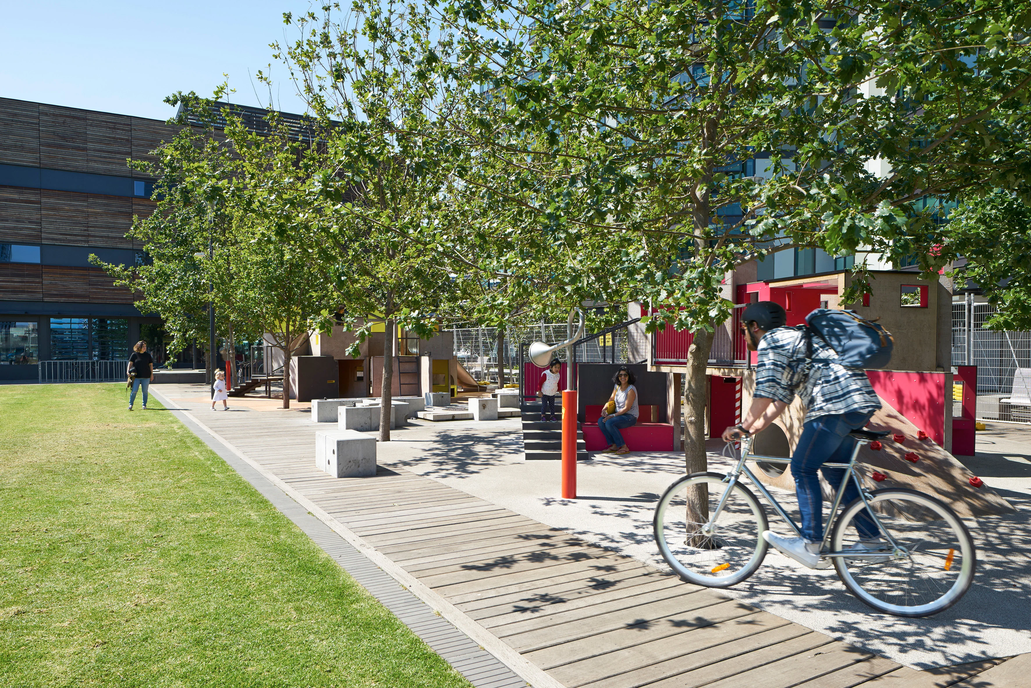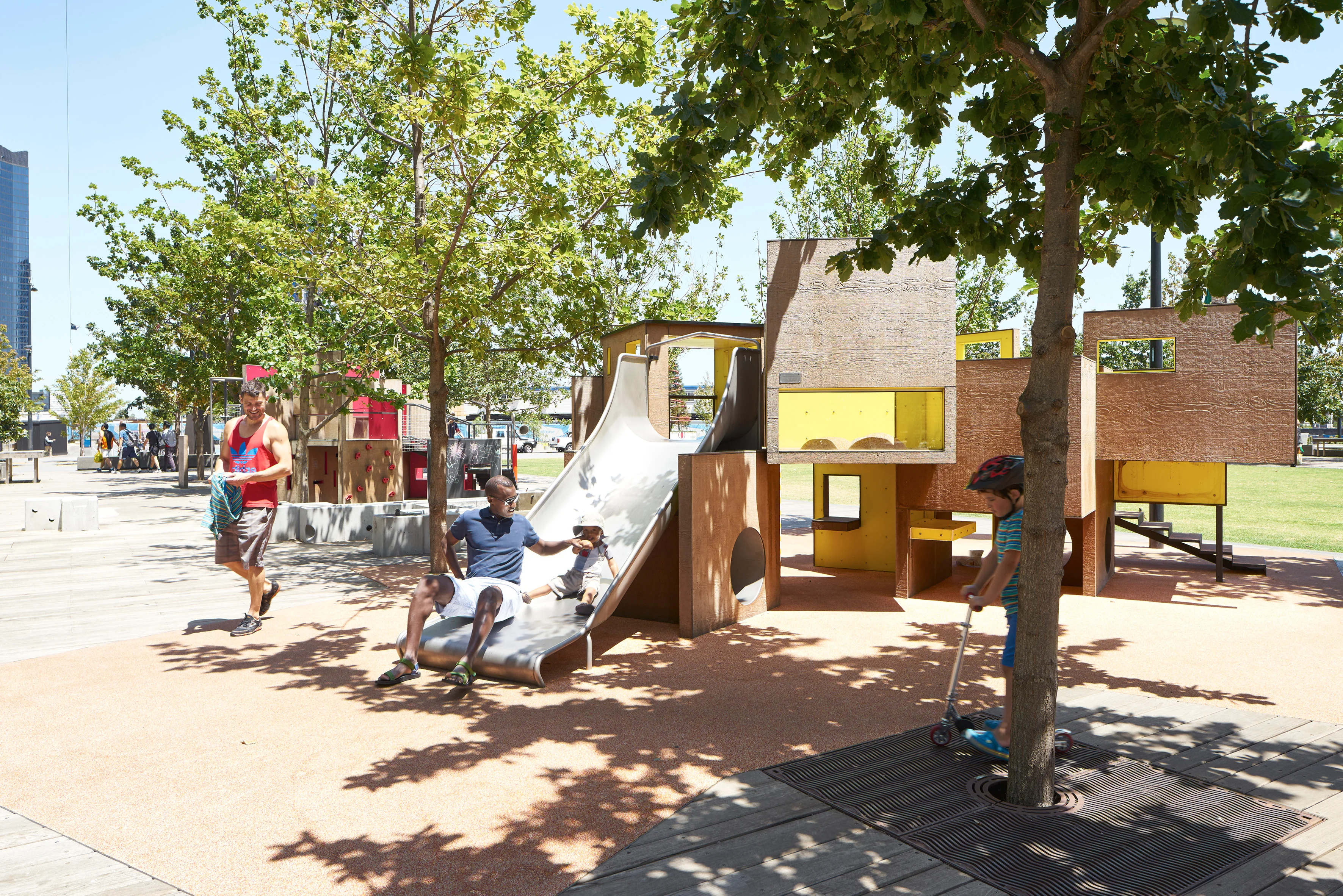 The park’s treed urban park setting provides a 500m2 play space combining a diversity of play, with three play space zones: sensory play, water play and adventure play, inspired by traditional child’s play (think cardboard boxes and cubby houses).