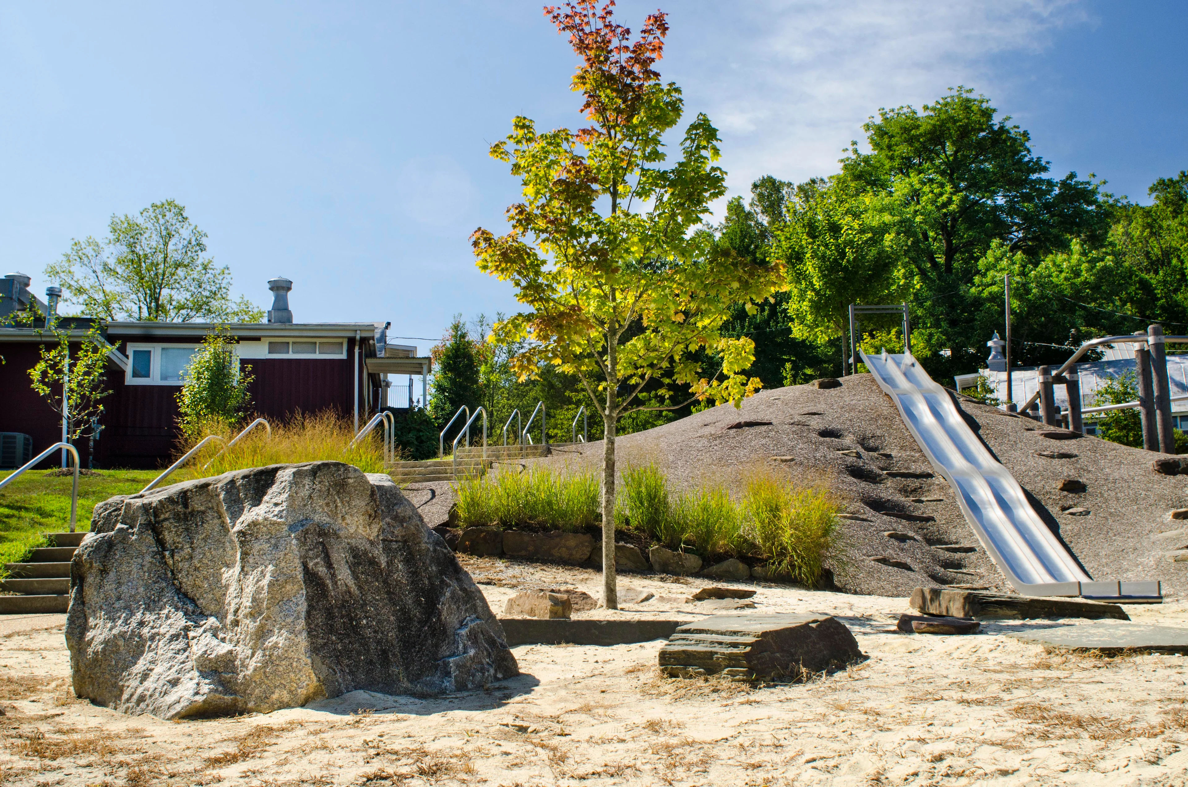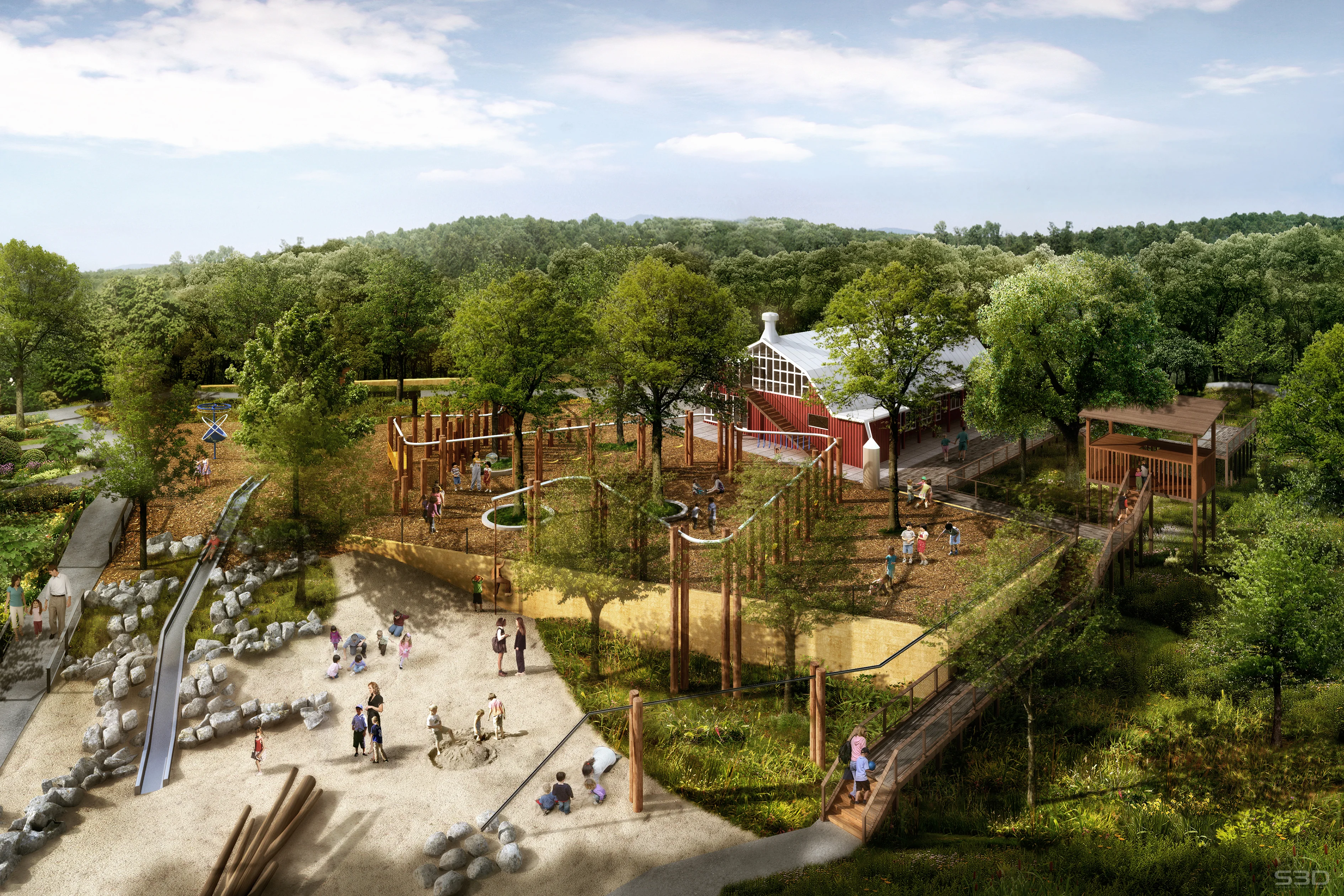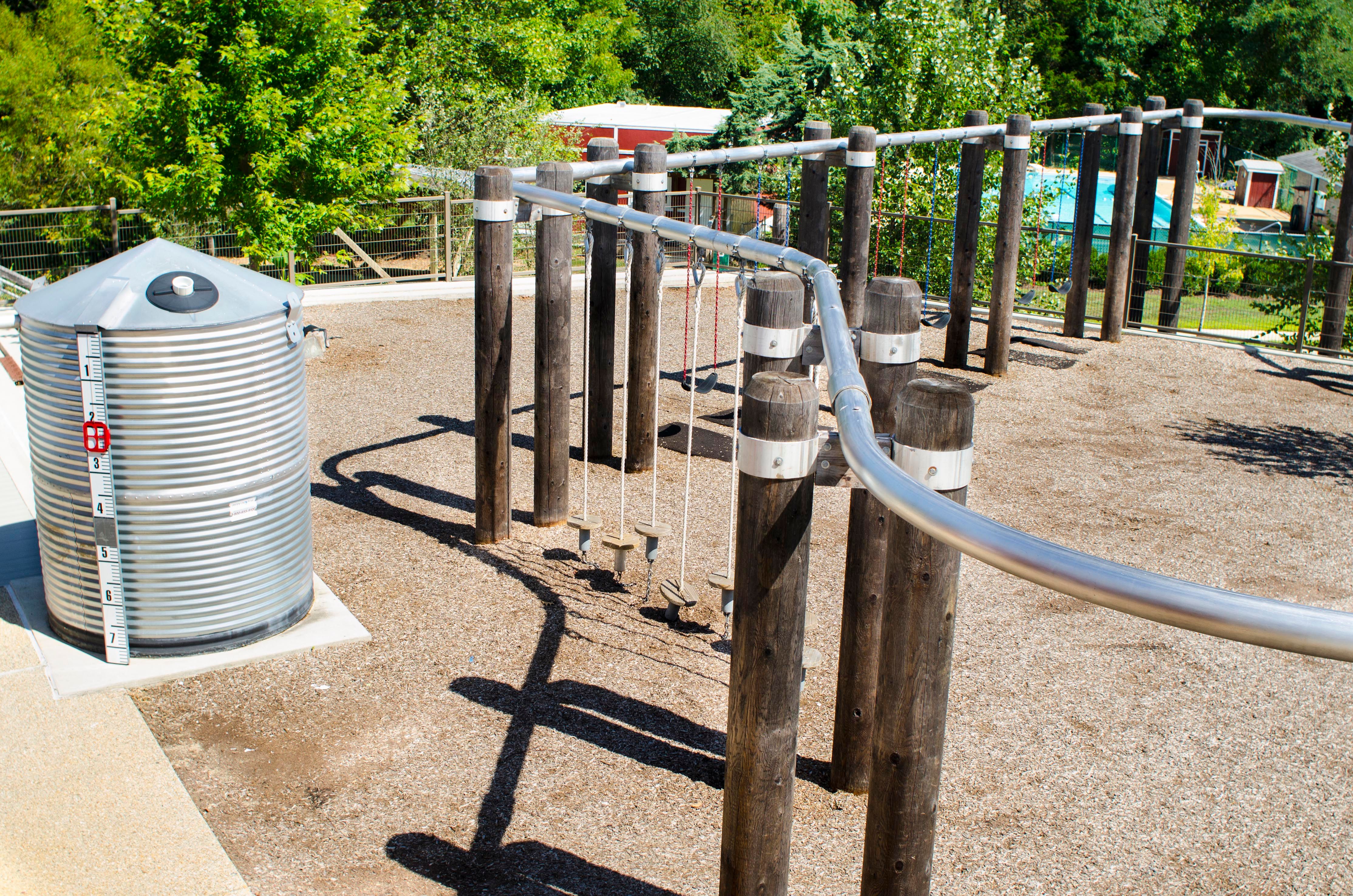 Responding to the client’s interest in creative play and engagement with nature, OCULUS designed several custom features. Among these, a 300-footlong elevated steel tube weaves throughout the play area, supporting swings, climbing nets, and monkey bars. Other elements include a 35-footlong embankment slide flanked by boulders, a climbing wall, and an area for wet play with water gates and hand pumps.