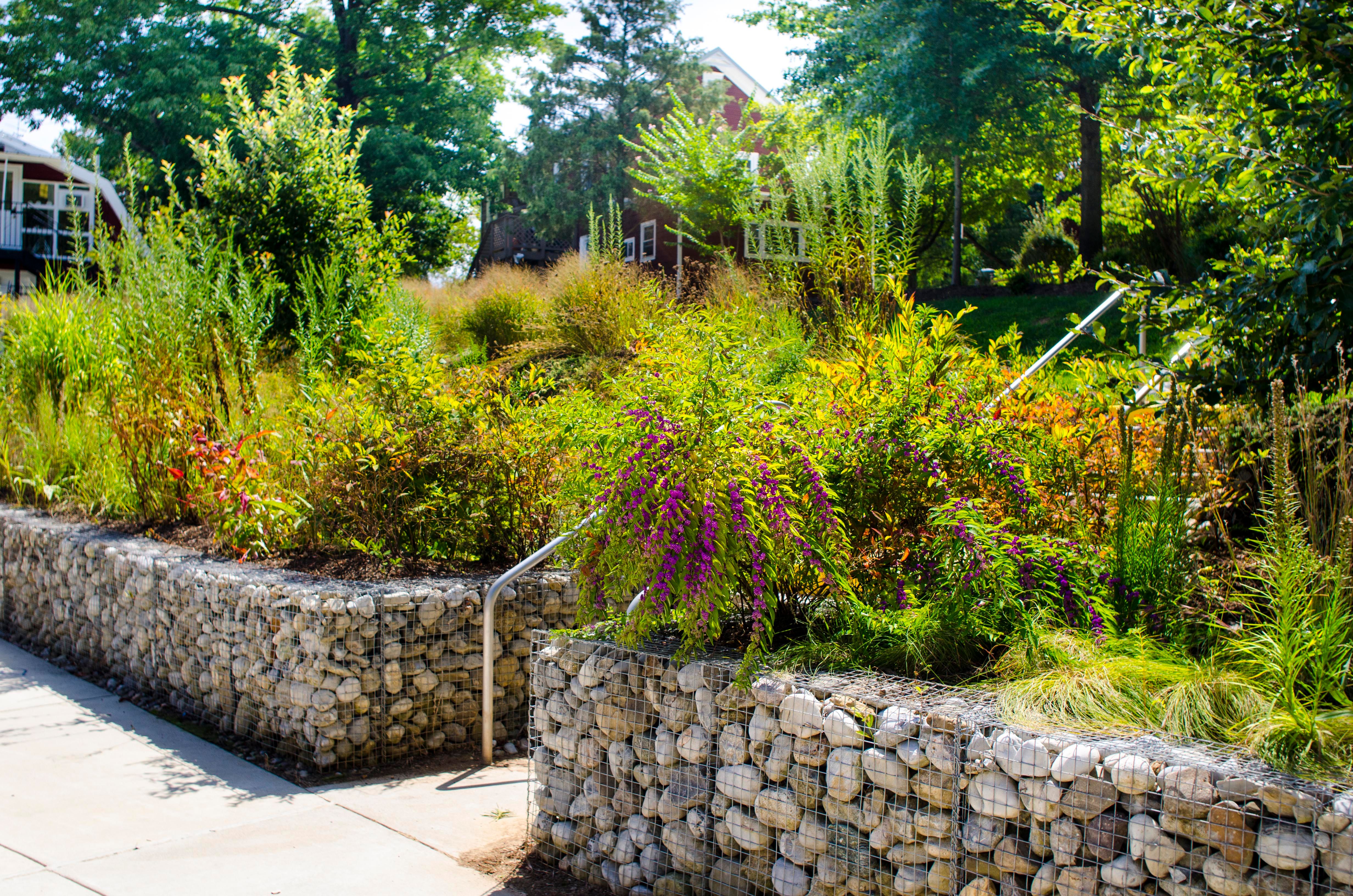 Addressing existing stormwater problems, OCULUS designed three rain gardens and a cistern that overflows via a concrete runnel into a bioretention area. The perimeter of a pre-existing stormwater pond was planted with a native meadow seed mix, designed to support pollinators and provide educational opportunities for students to learn about biodiversity. A gabion wall retains planted terraces along the hillside that connects the classroom to the playground, and an orchard of heirloom apples, pears, plums, and peaches has been planted on the periphery of the campus for students to pick.