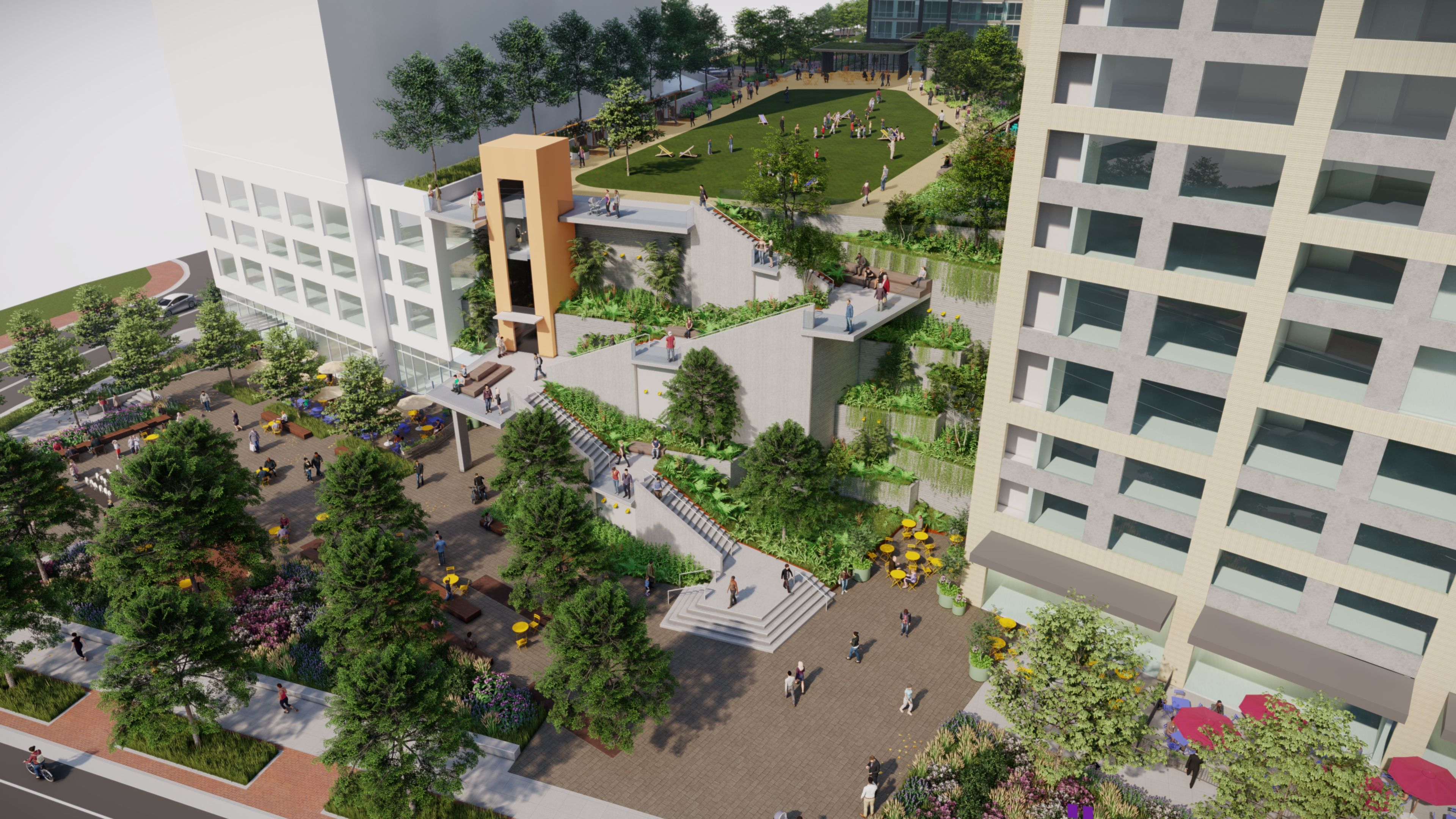 Construction of the expanded municipal wastewater treatment plant – the first phase of the master plan – was completed in 2015. A new athletic field conceals the facility’s wastewater holding tanks and establishes public green space in an area of the city saturated with hardscape plazas. The subsequent phases of the project will expand on open space already created and connect the urban mixed-use development to the north with the stream corridor to the south via the elevated park. Key to this connection is the Transition Zone; the amalgamation of gardens, stairs, and overlooks that cascade from the top of the five-story public park to the street-level urban plaza. Beyond just conveying visitors from the plaza to the park, the Transition Zone will also function as an iconic place maker at the terminus of East Eisenhower Avenue.