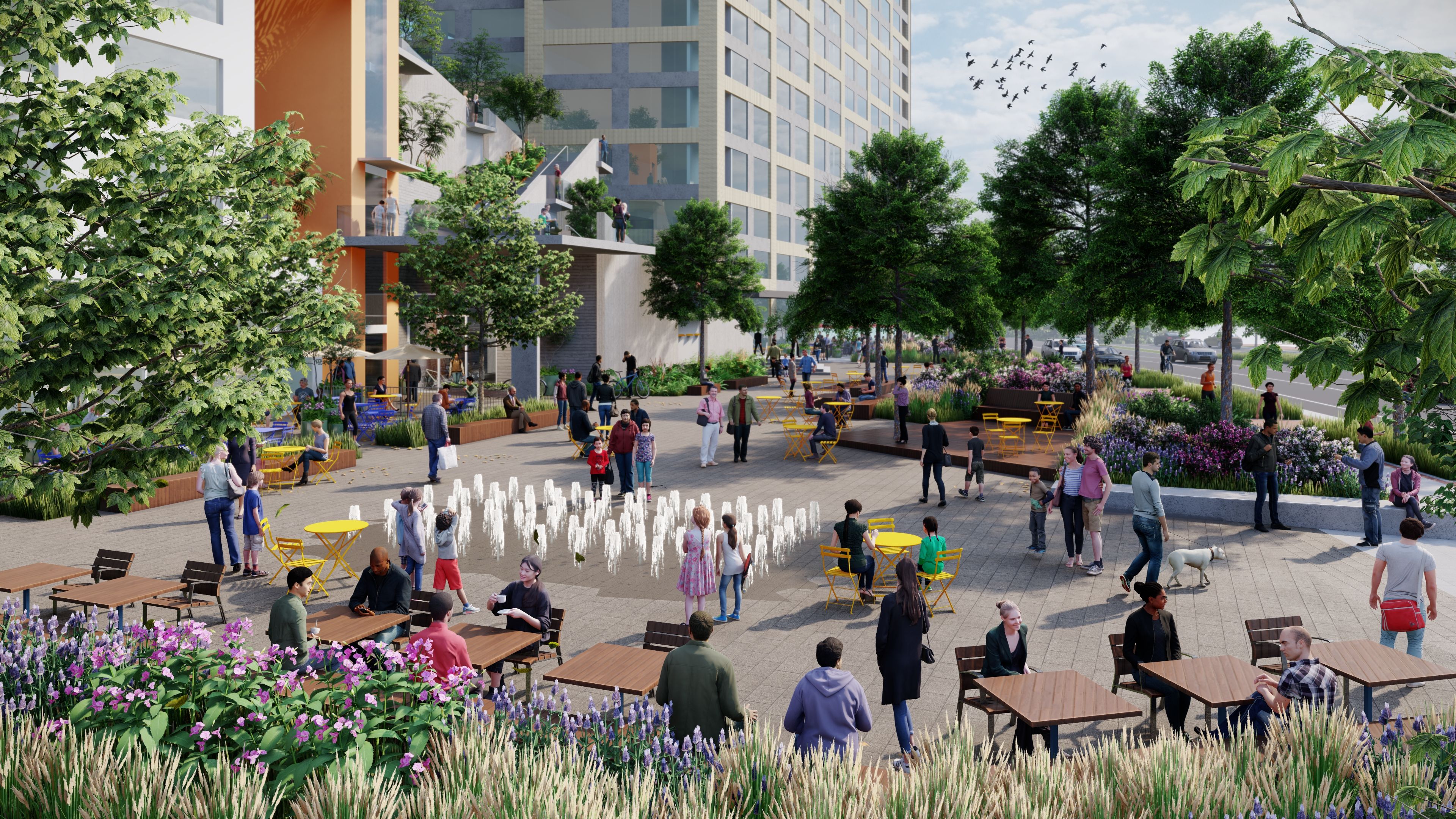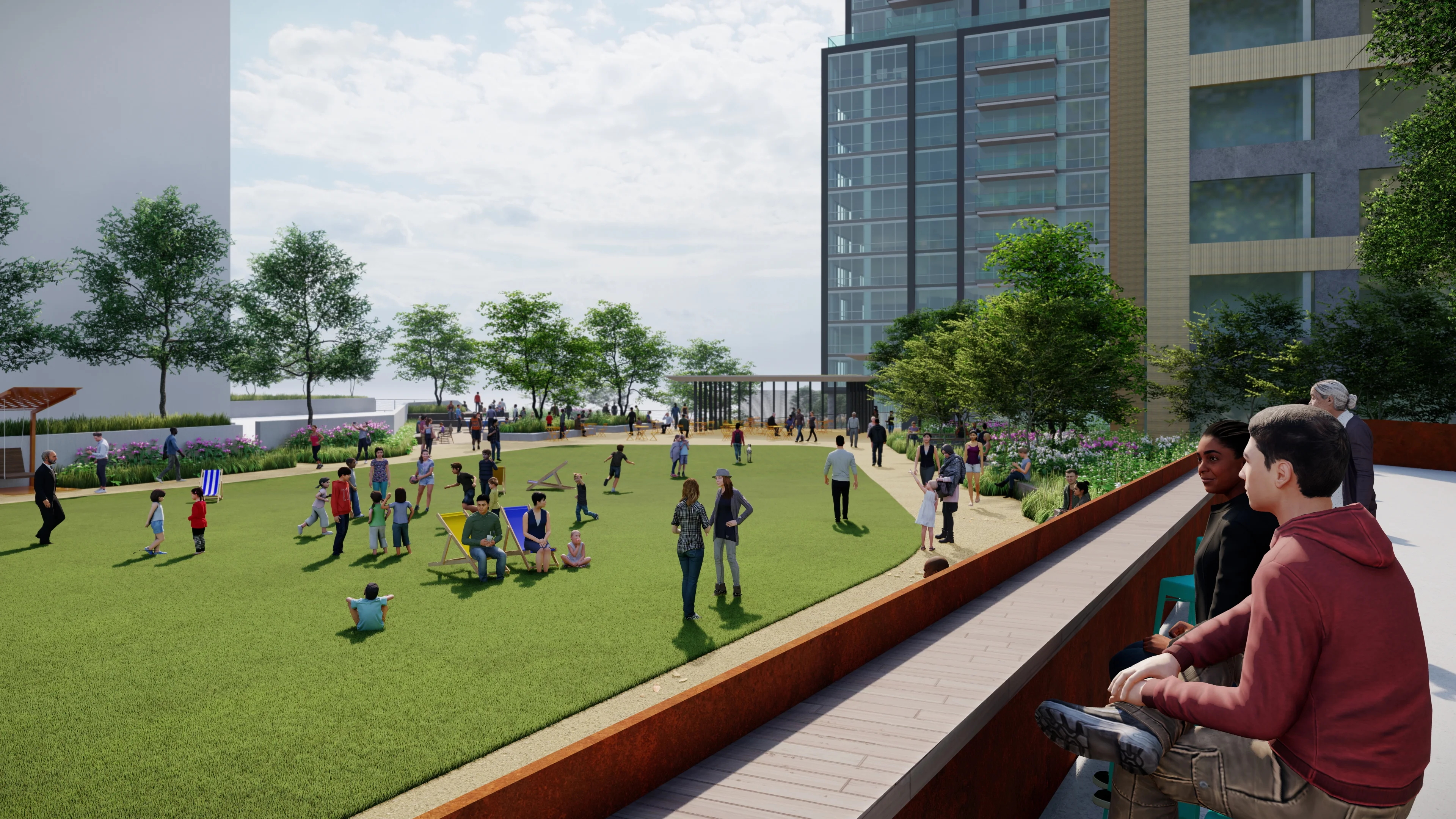 Once a site that hosted a range of industrial uses – from rail yards to a municipal landfill – the Carlyle Park Master Plan provides a framework for an ambitious program of interwoven public parkland, mixed-use development, and municipal services. Originally approved in 2012 and amended in 2021, the plan harnesses unique landscape strategies to transform an elevated parking deck – designed to cap residual contaminated soils – into a vibrant public space that folds down to engage the civic realm through an arrangement of ramps, stairs, stormwater management components, and overlooks.