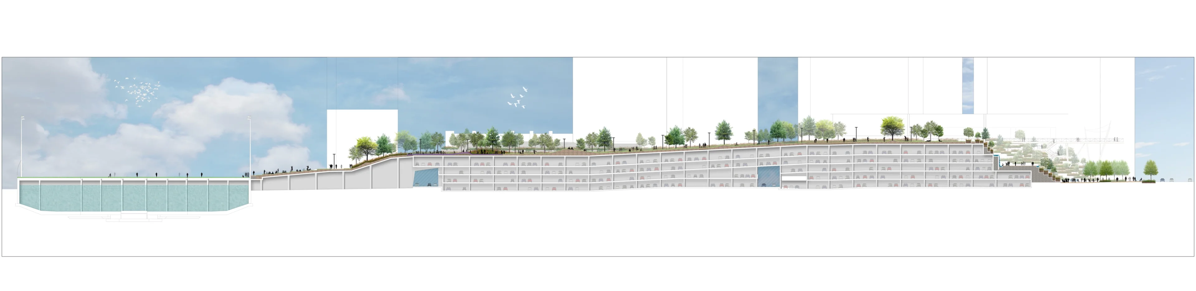 Due to the nature of the site, environmental stewardship has always been at the forefront throughout the entire design process. The park irrigation system and building mechanical systems both utilize reclaimed water treated at the adjacent wastewater facility, while on site bio-filtration plantings process stormwater before discharging it to a nearby stream. Finally, the above-grade garage is equipped with a methane gas harvesting system that will collect gasses released from the decomposition of landfill materials beneath the site.