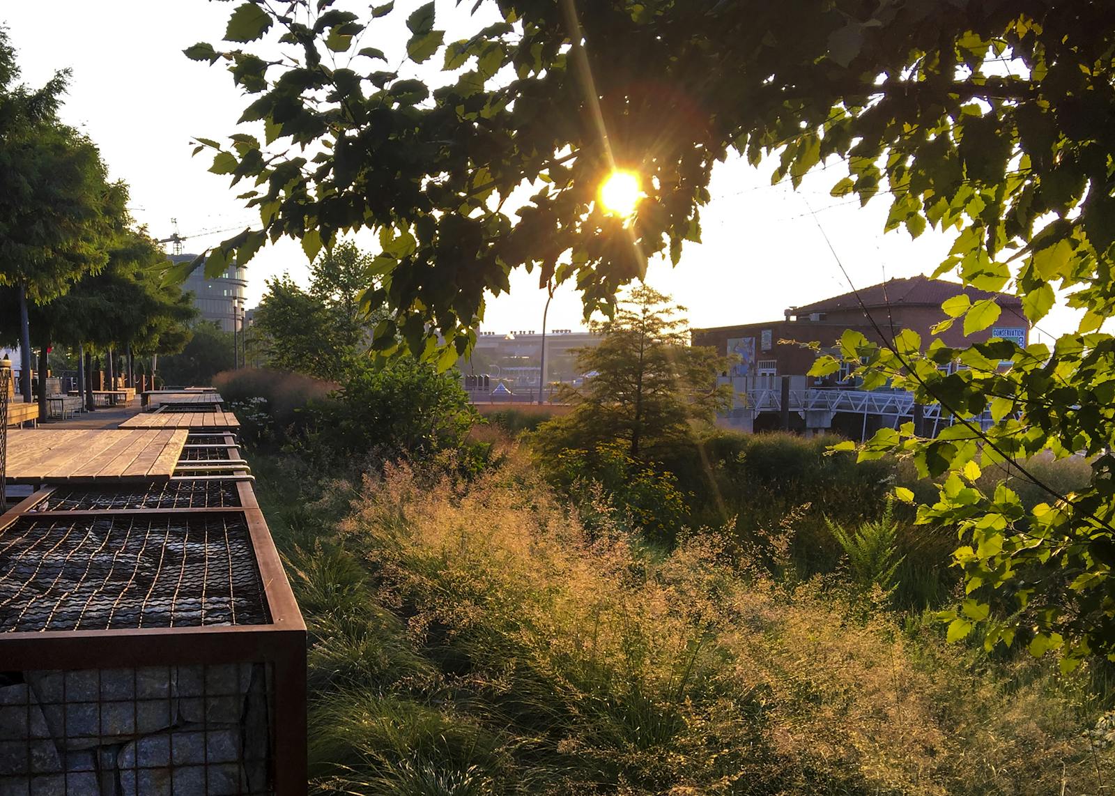 The landscape of the mixed-use Dock 79, completed in 2016, celebrates the riverfront while it amplifies the site’s unique cultural and natural contexts. With plazas, a promenade, outdoor dining terraces, and intimate spaces, the OCULUS scheme creatively accommodates both public and private functions.