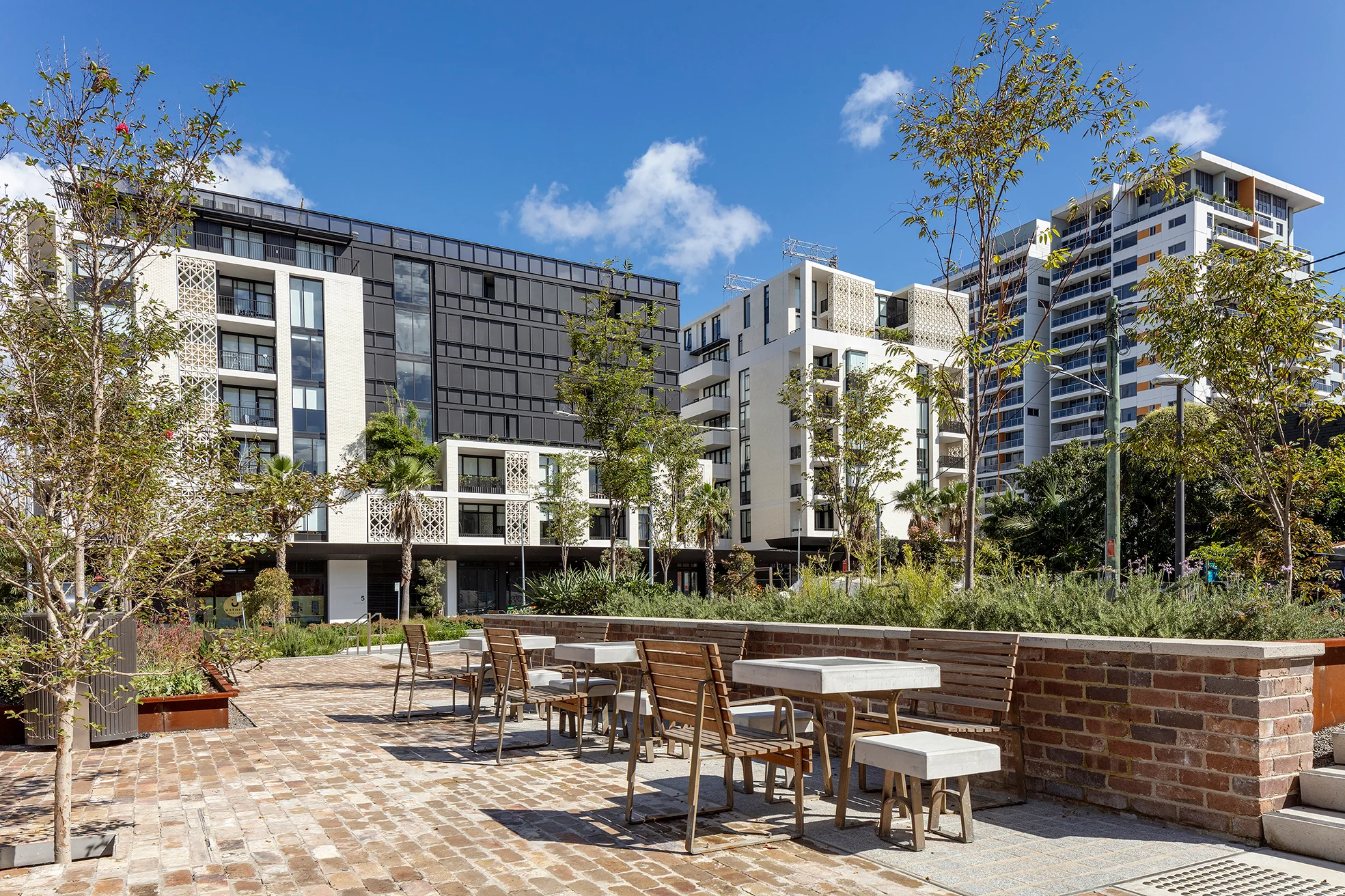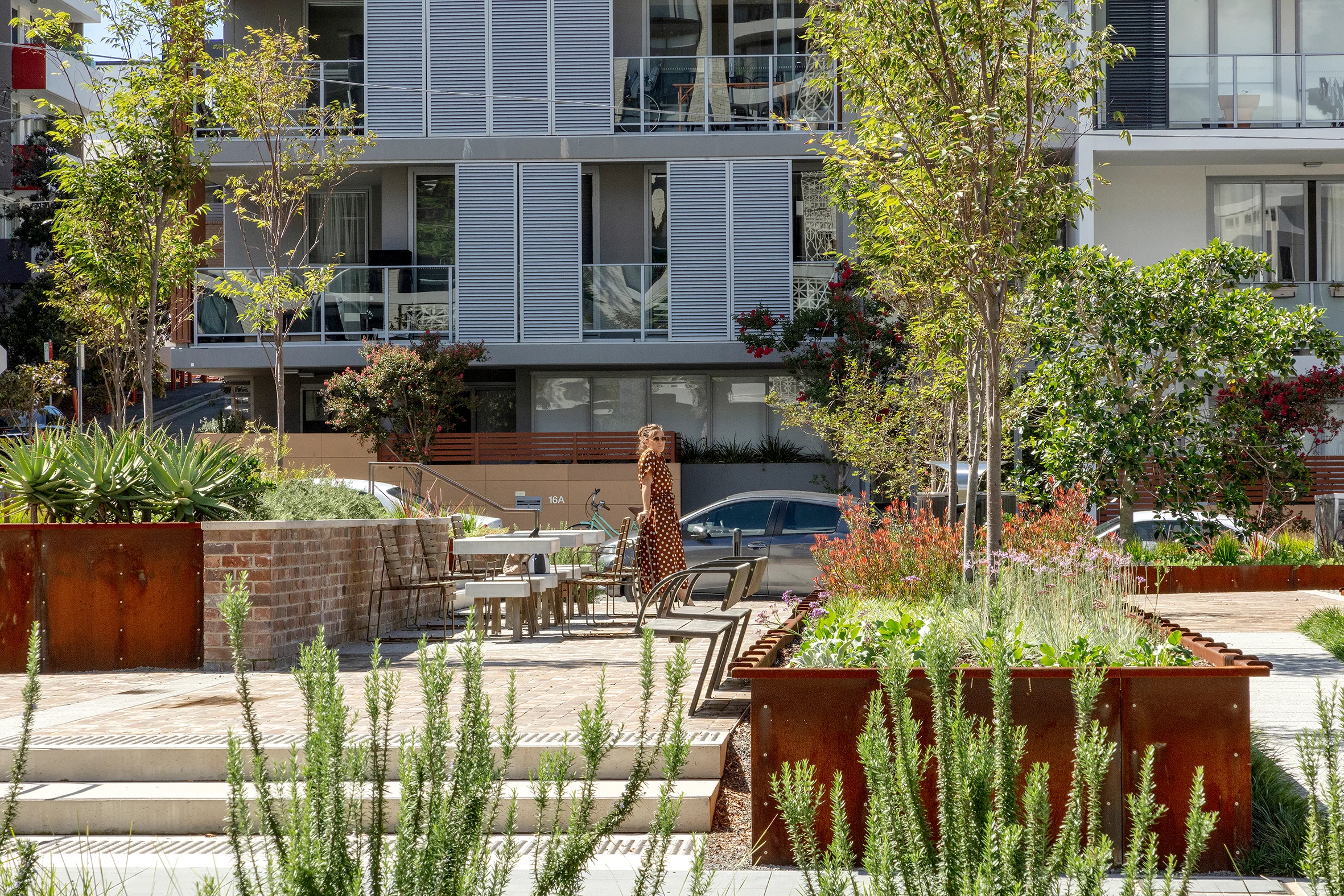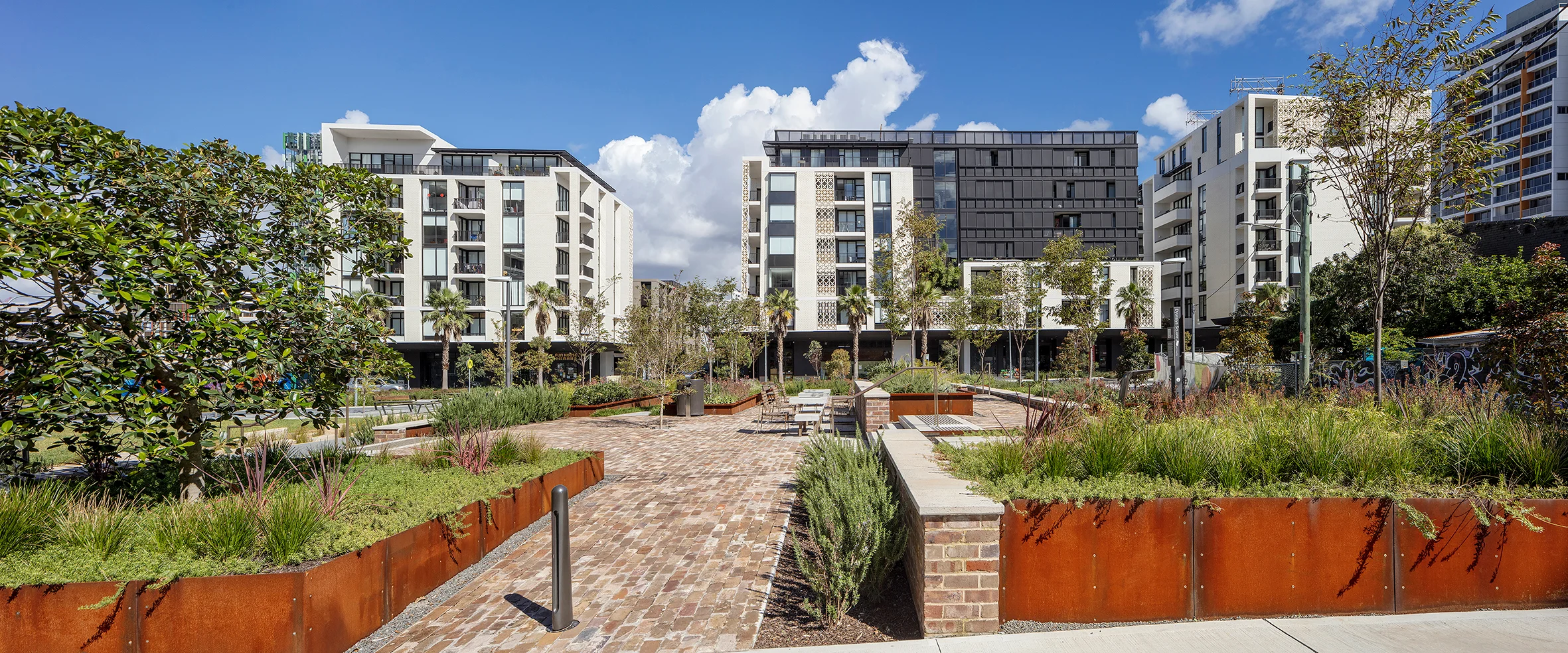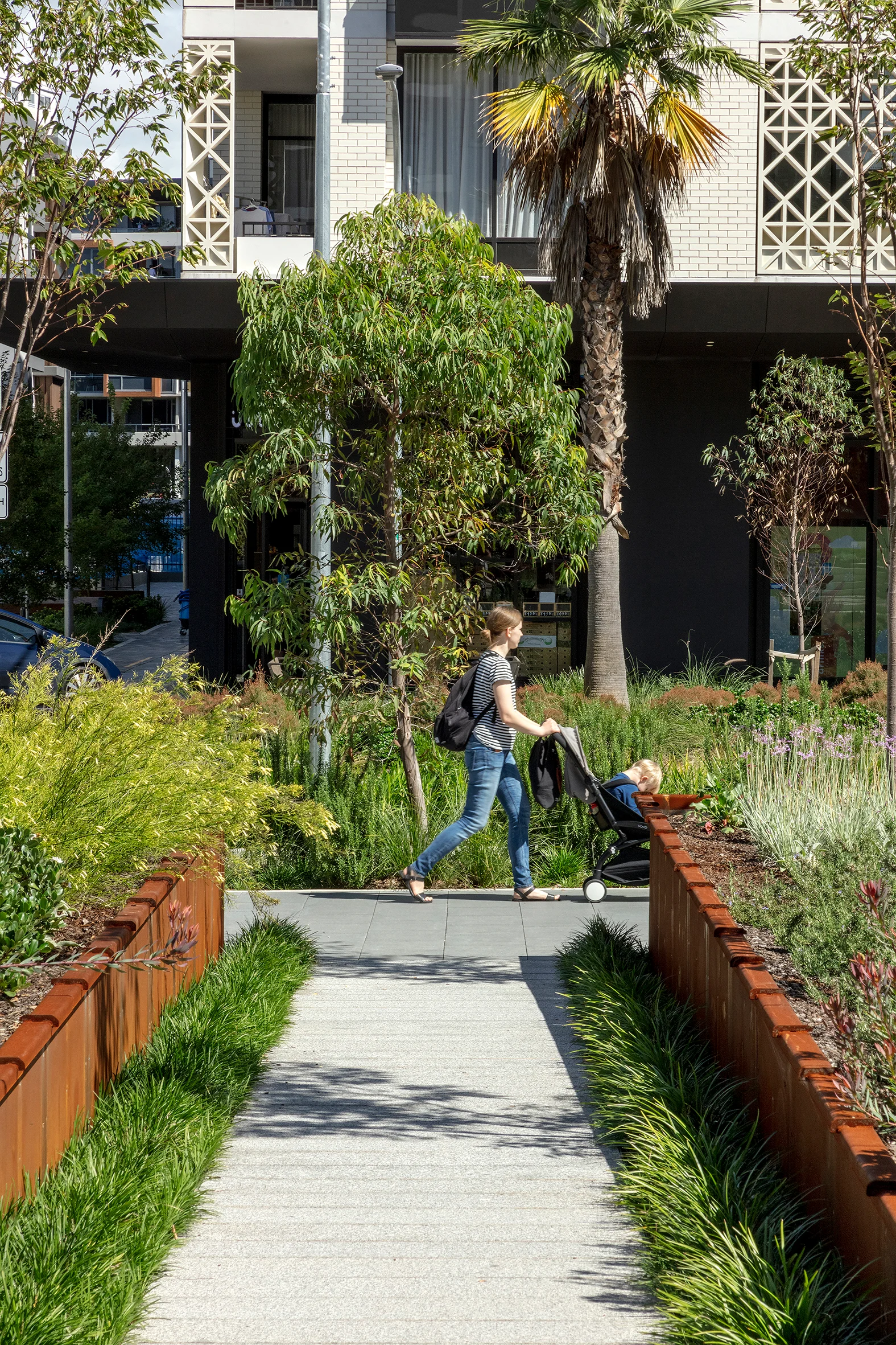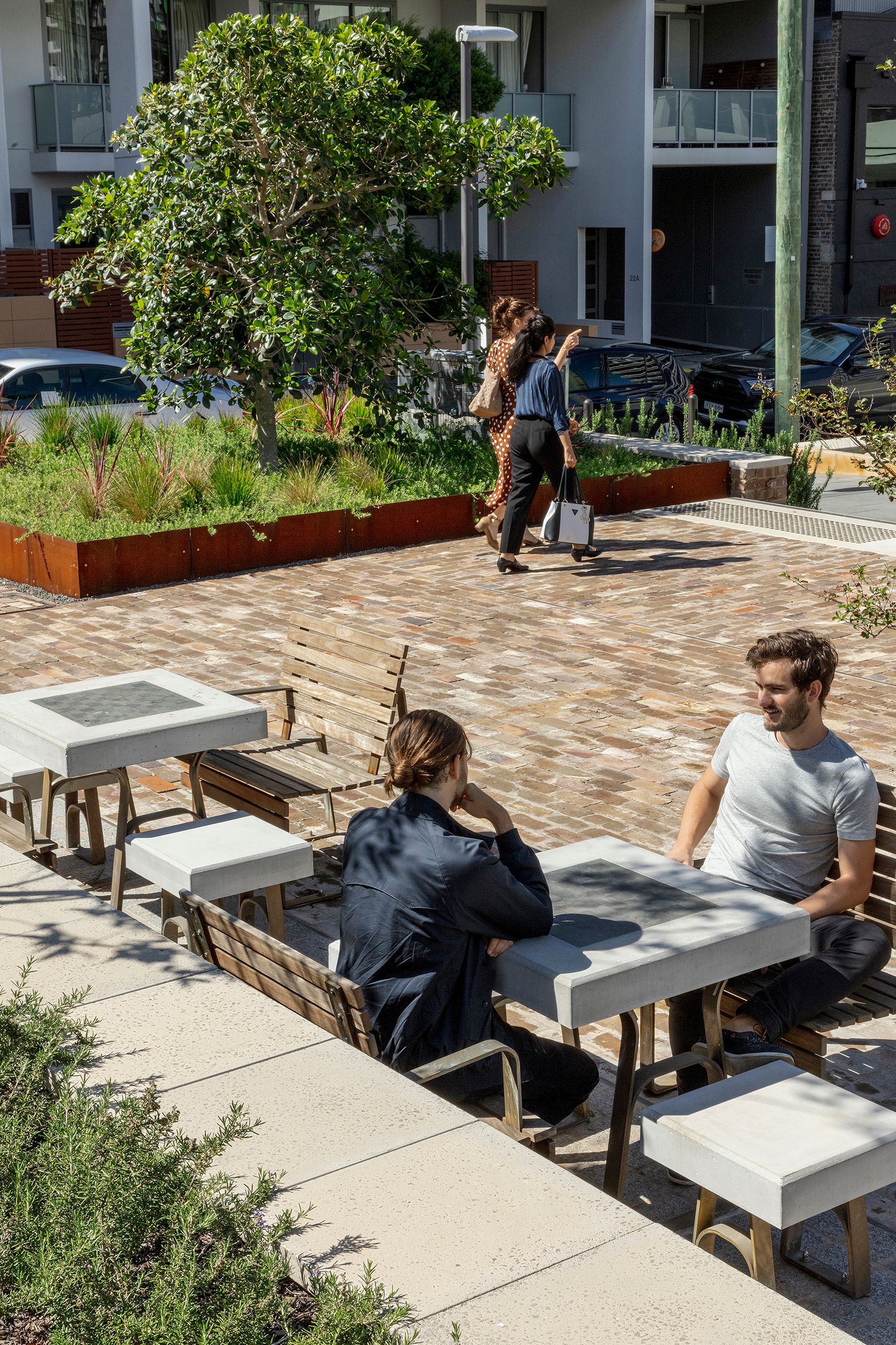 The design interprets and reveals the site’s rich natural and cultural history in different ways. The arrangement of the garden rooms mirrors the layout of landscape terraces that used to occupy the site while a water sculpture references an original swamp line that traversed the lower half of the site. The arrangement of furniture, paving and tree pits is guided by more recent industrial history, specifically the former factory alignments which are depicted as inlays in the paving.