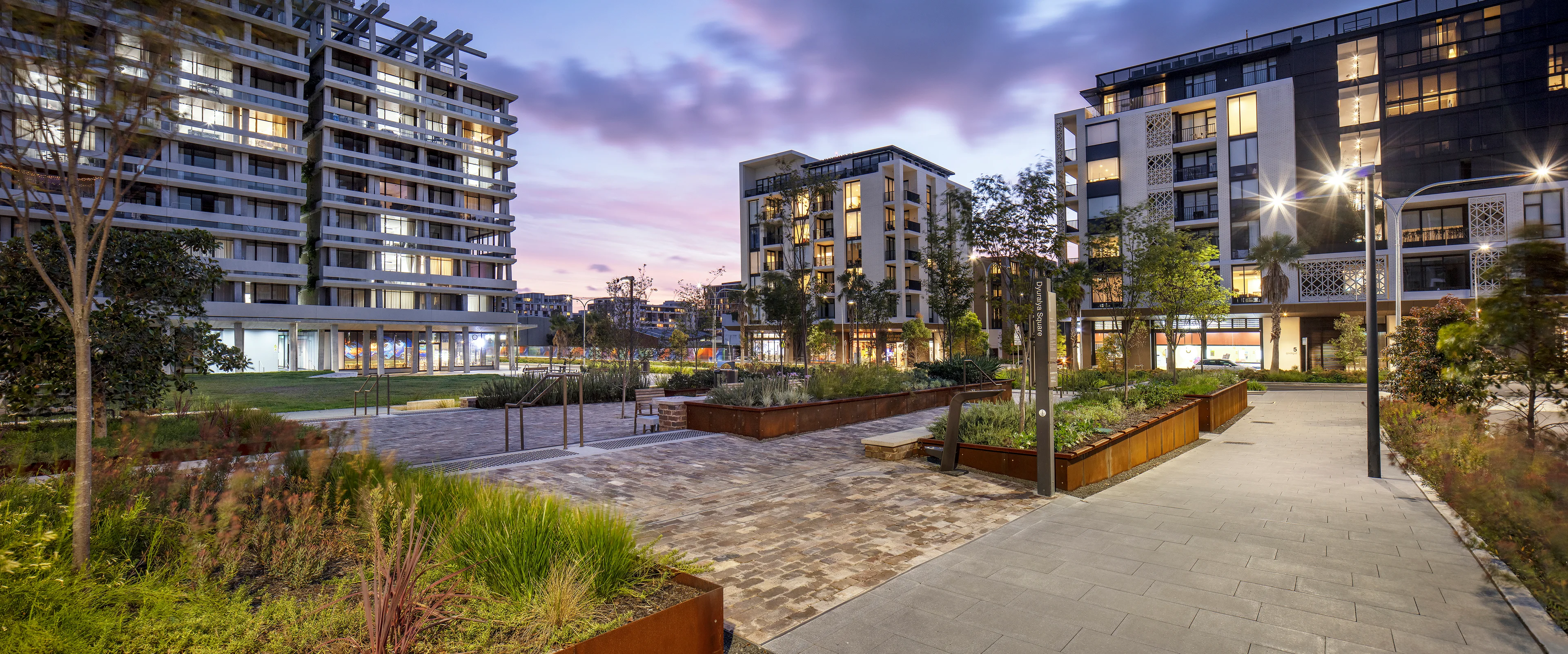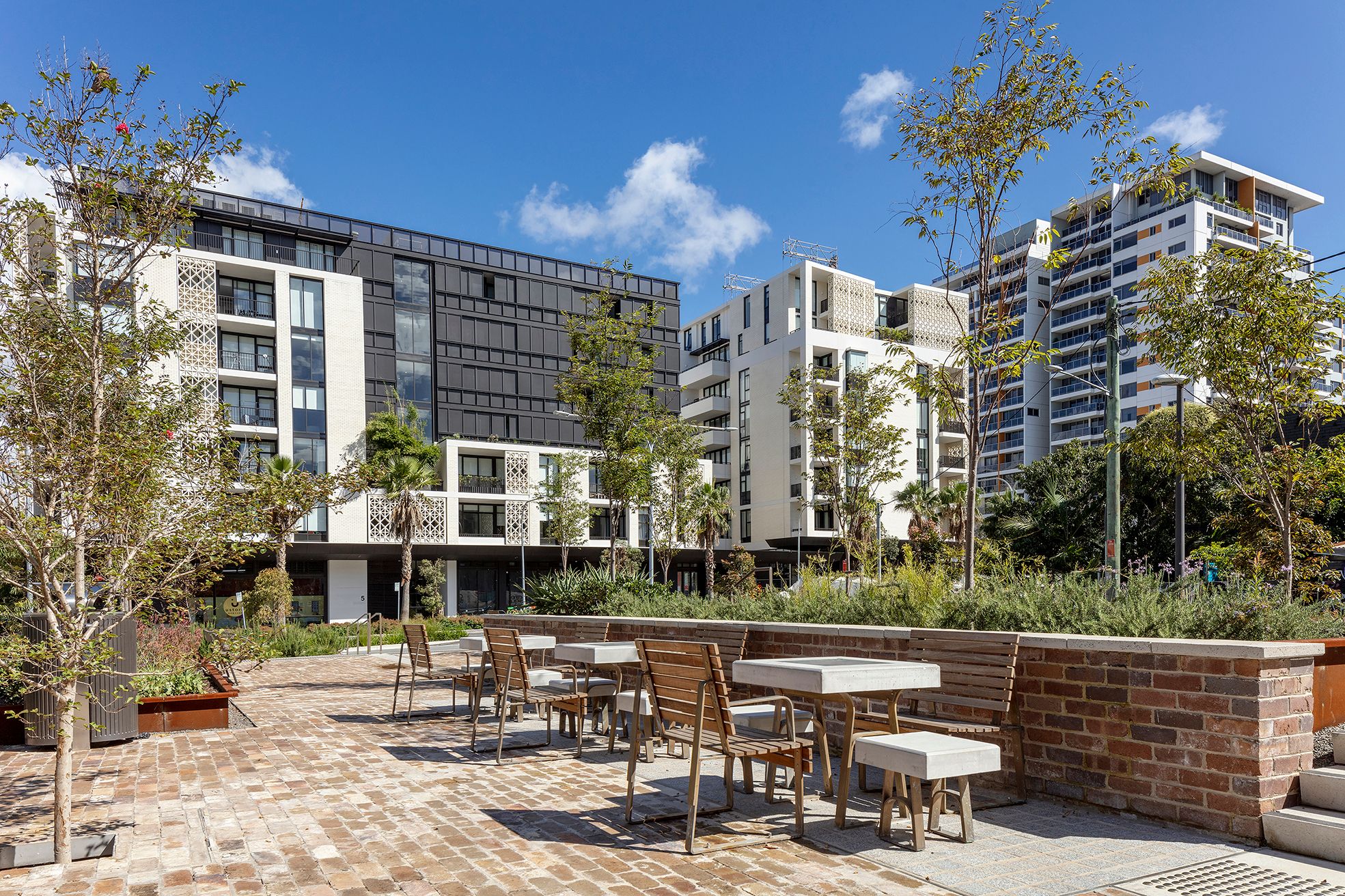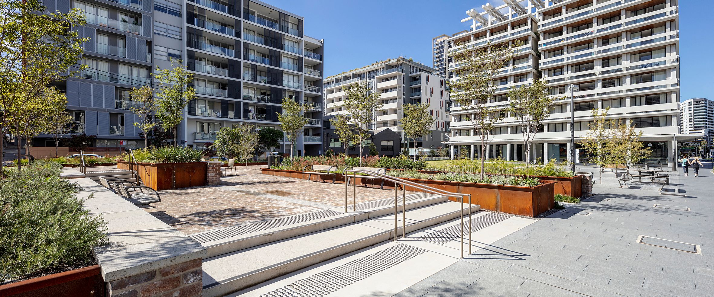 OCULUS was engaged by the City of Sydney to design Dyuralya Square, a large civic square at the heart of Sydney’s Lachlan Precinct near Moore Park. Located on Gadigal Avenue adjacent to a planned light rail stop, the square is designed as a place for small events (e.g. markets and swap-meets), incidental play, day-to-day recreation and outdoor dining. The square contains a series of garden rooms for relaxation and socialisation, a lawn terrace and several urban courts.