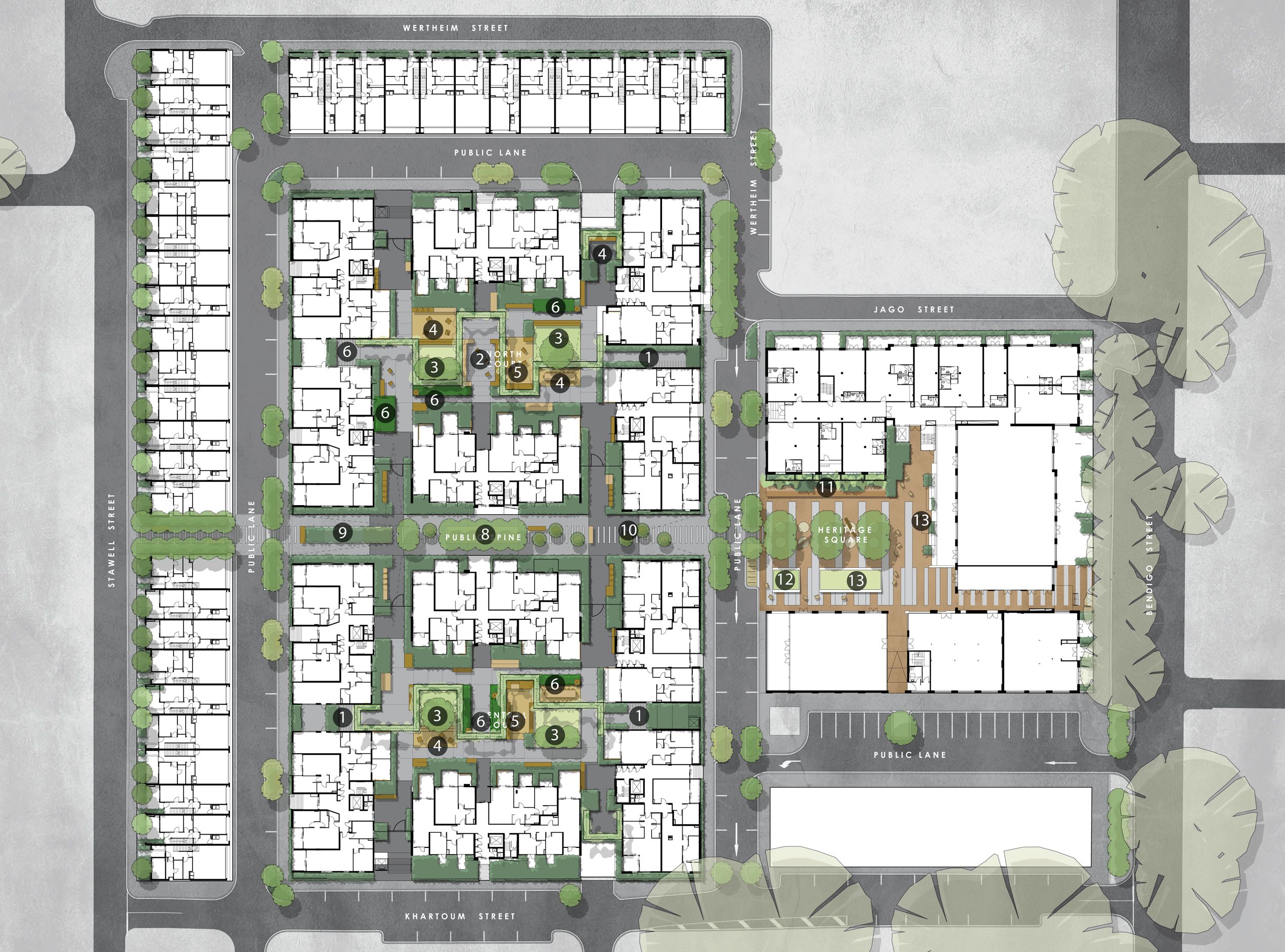 The principle public space is a plaza whose edges are formed on three sides by the heritage listed Weirtheim Piano Factory, activated by a community facility, cafe and residential addresses. Secondary spaces are spread across the precinct.