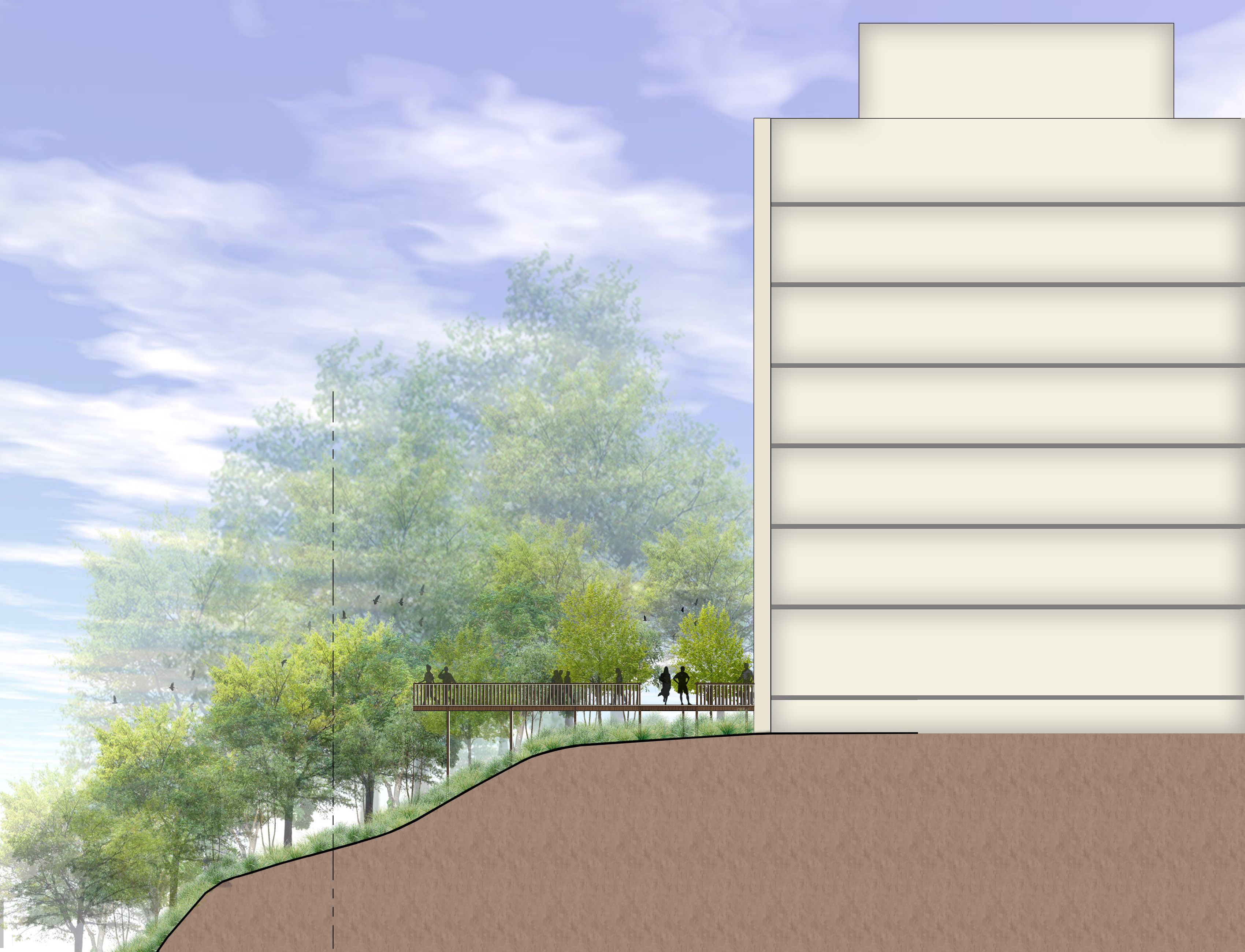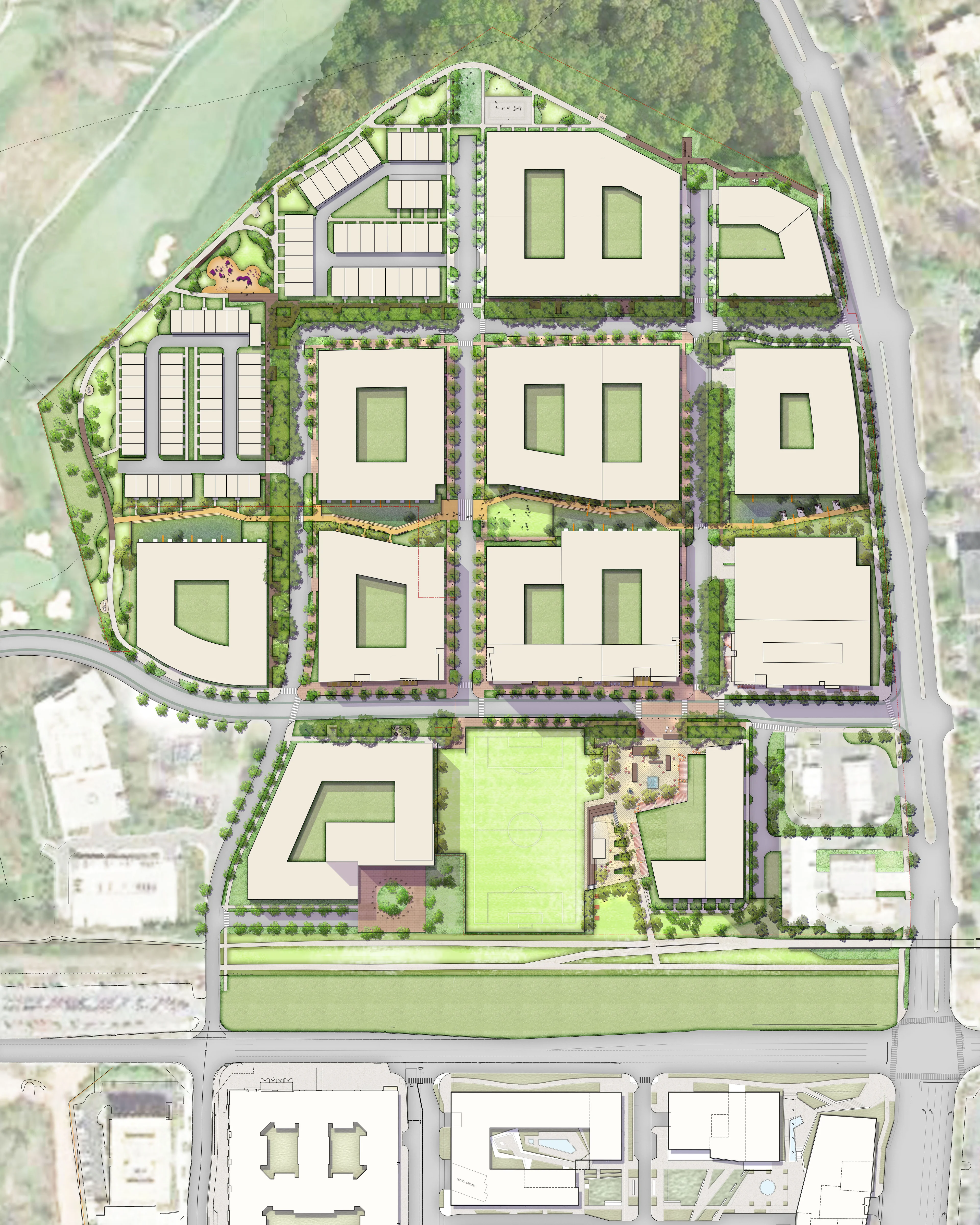 Responding to the Fairfax County Comprehensive Plan, the project area will function as a transition zone from the higher densities associated with the Metro Station to Reston’s less-dense, already established residential communities. Intended to be a pedestrian-centric environment integrated with public urban park spaces, the master plan comprises ten development blocks of housing, retail, and office use as well as a commercial center, preserves existing mature tress as a public park, and provides key connections to the Washington & Old Dominion Trail.