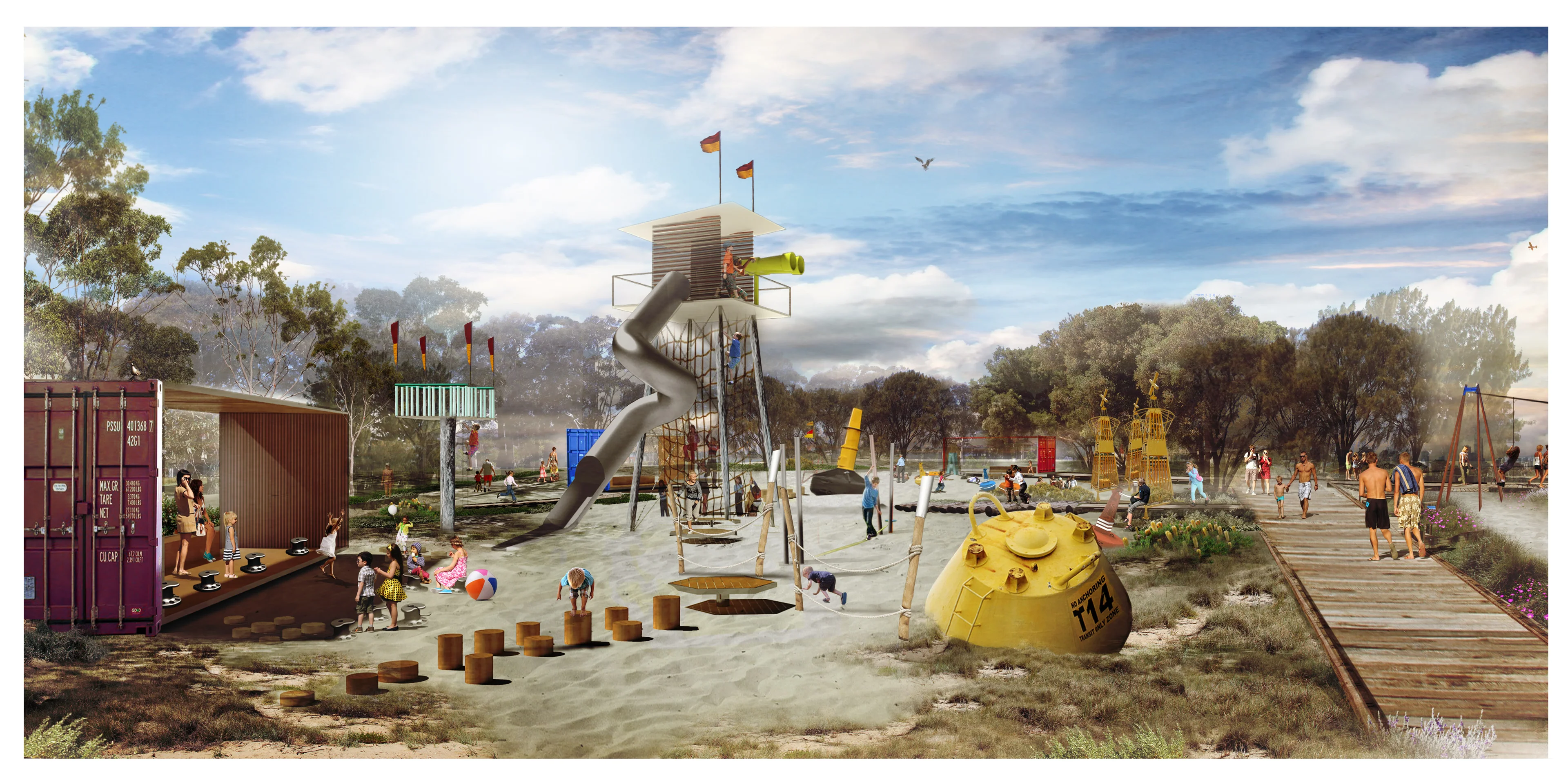 Maritime Cove Playspace is an integrated destinational playspace within the Perc White Reserve, Port Melbourne. OCULUS was engaged by the Port of Melbourne Corporation to create this maritime-themed playspace nestled in the dunal foreshore setting of Port Phillip. The project provided an opportunity to develop a distinctive and bespoke nature-based playspace environment that incorporates a range of activities for children and adults.