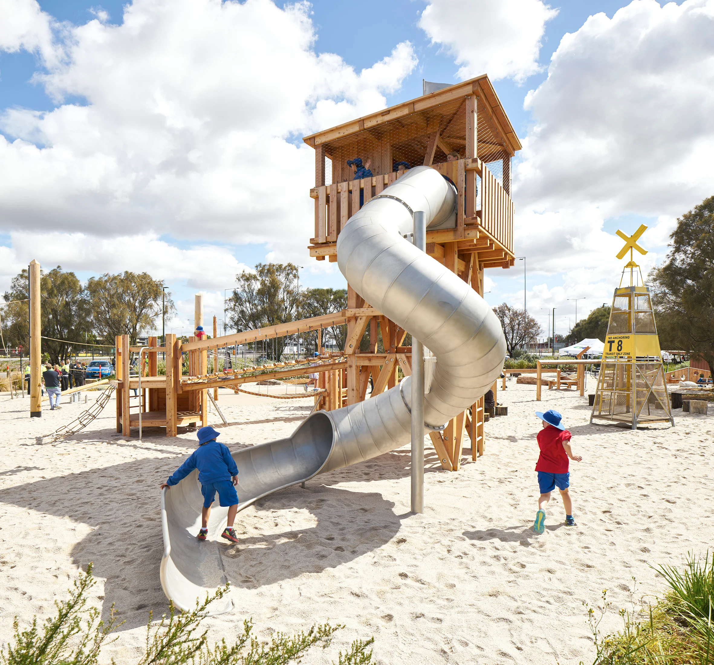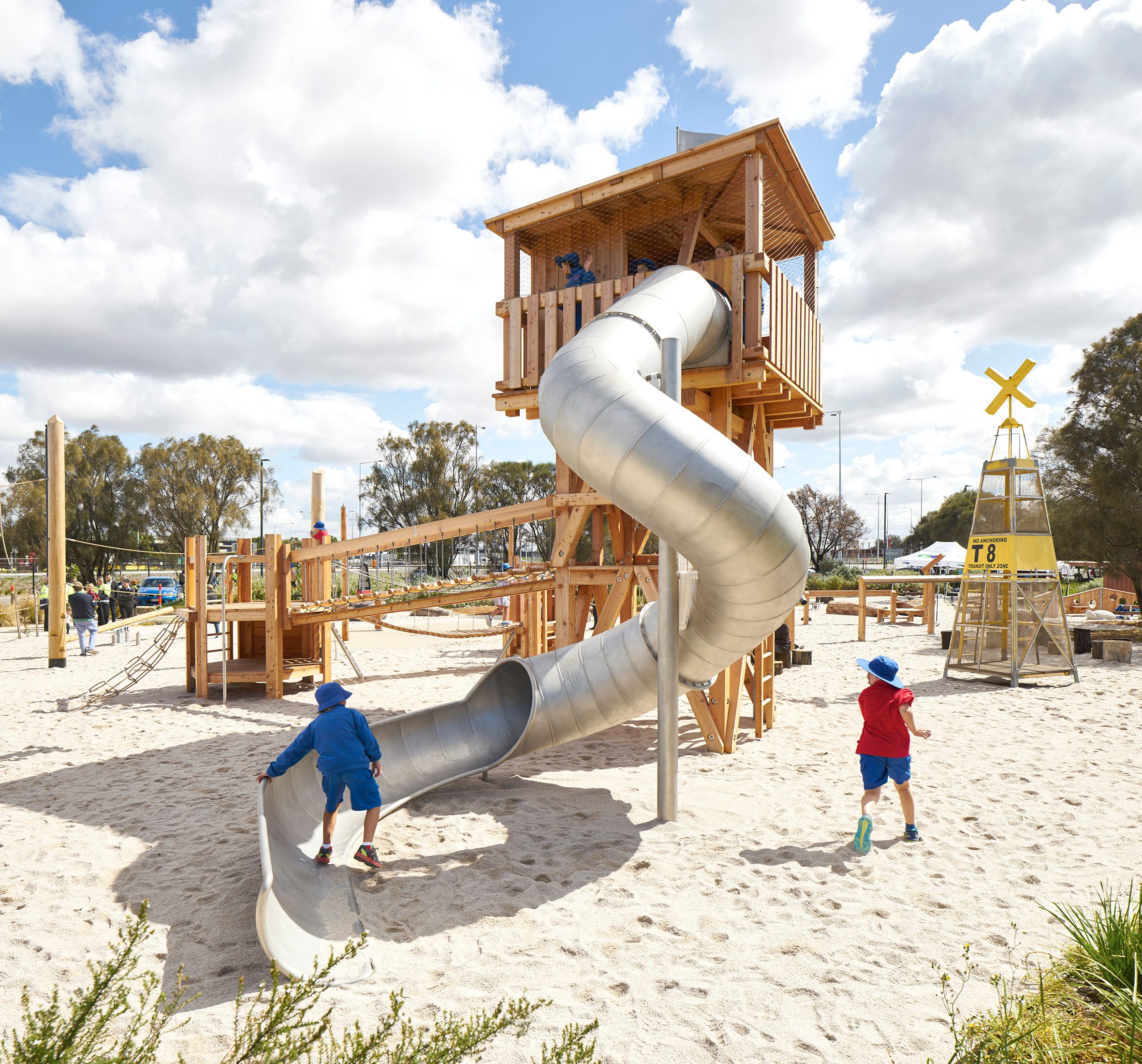 The playspace is curated and gradated – based on risk and interest – from below 3 years of age through to teenagers. The design includes customised and bespoke equipment, engaging the senses with water and sound. Interpretative signage educates the community about the re-purposed equipment.