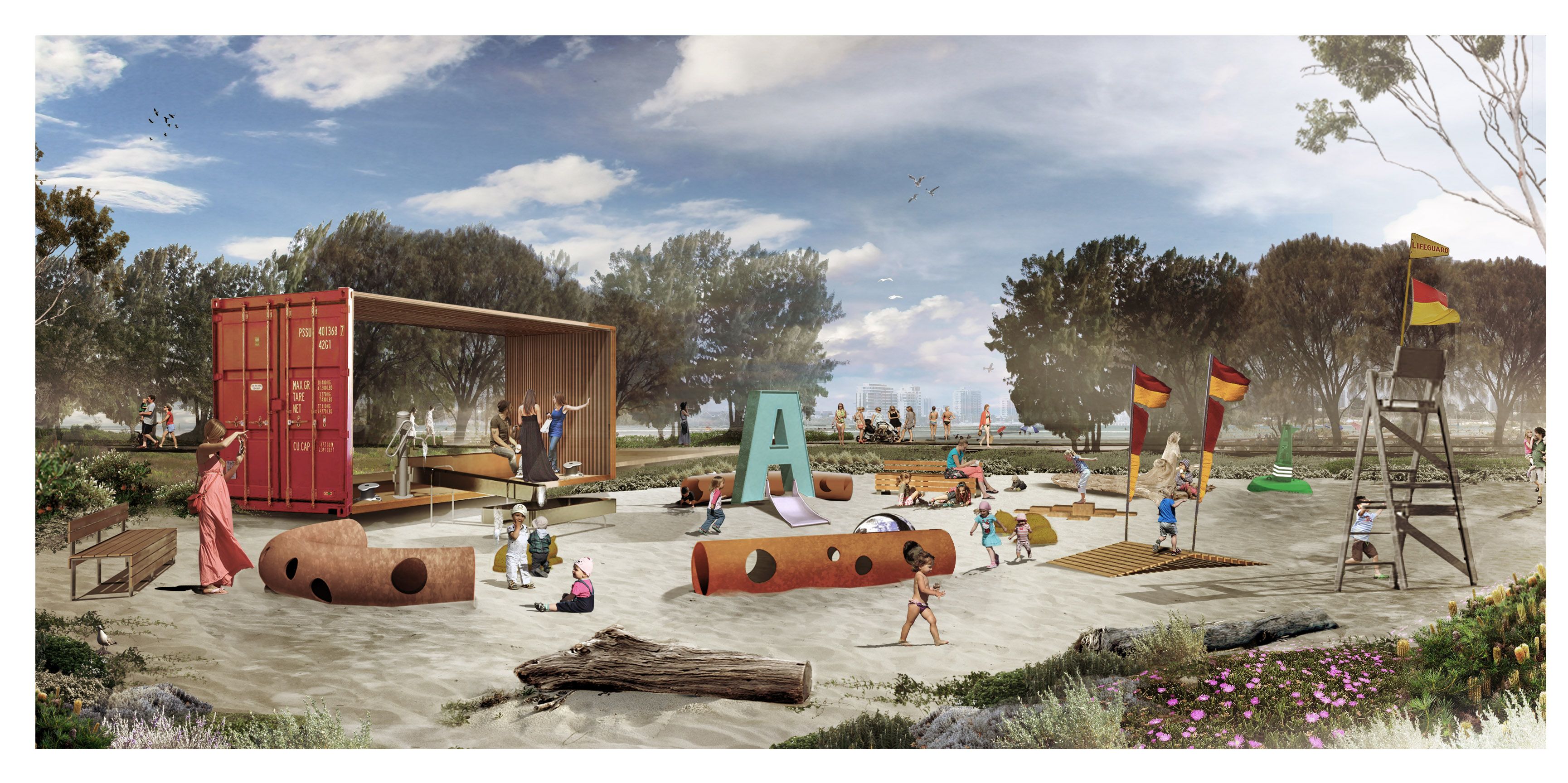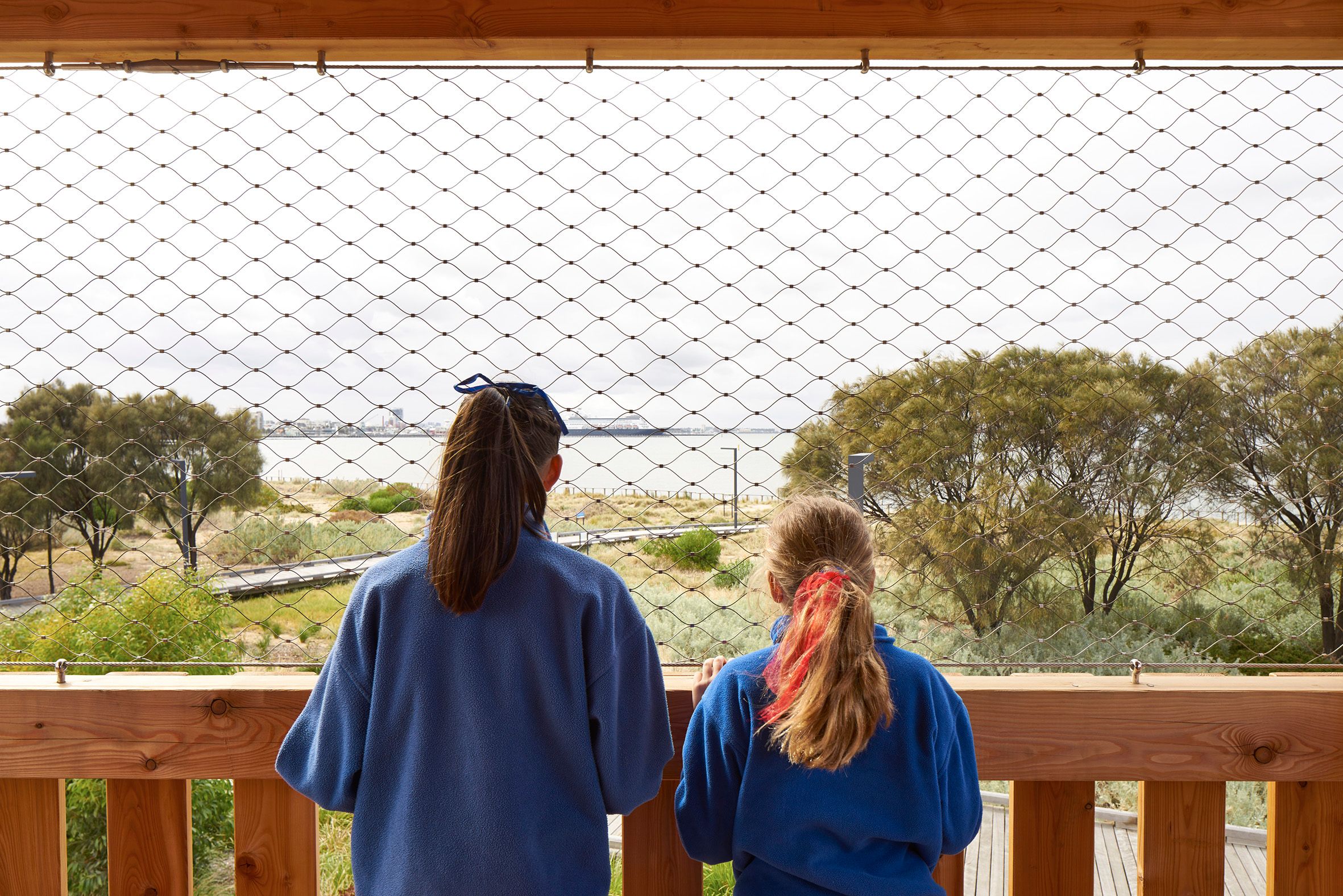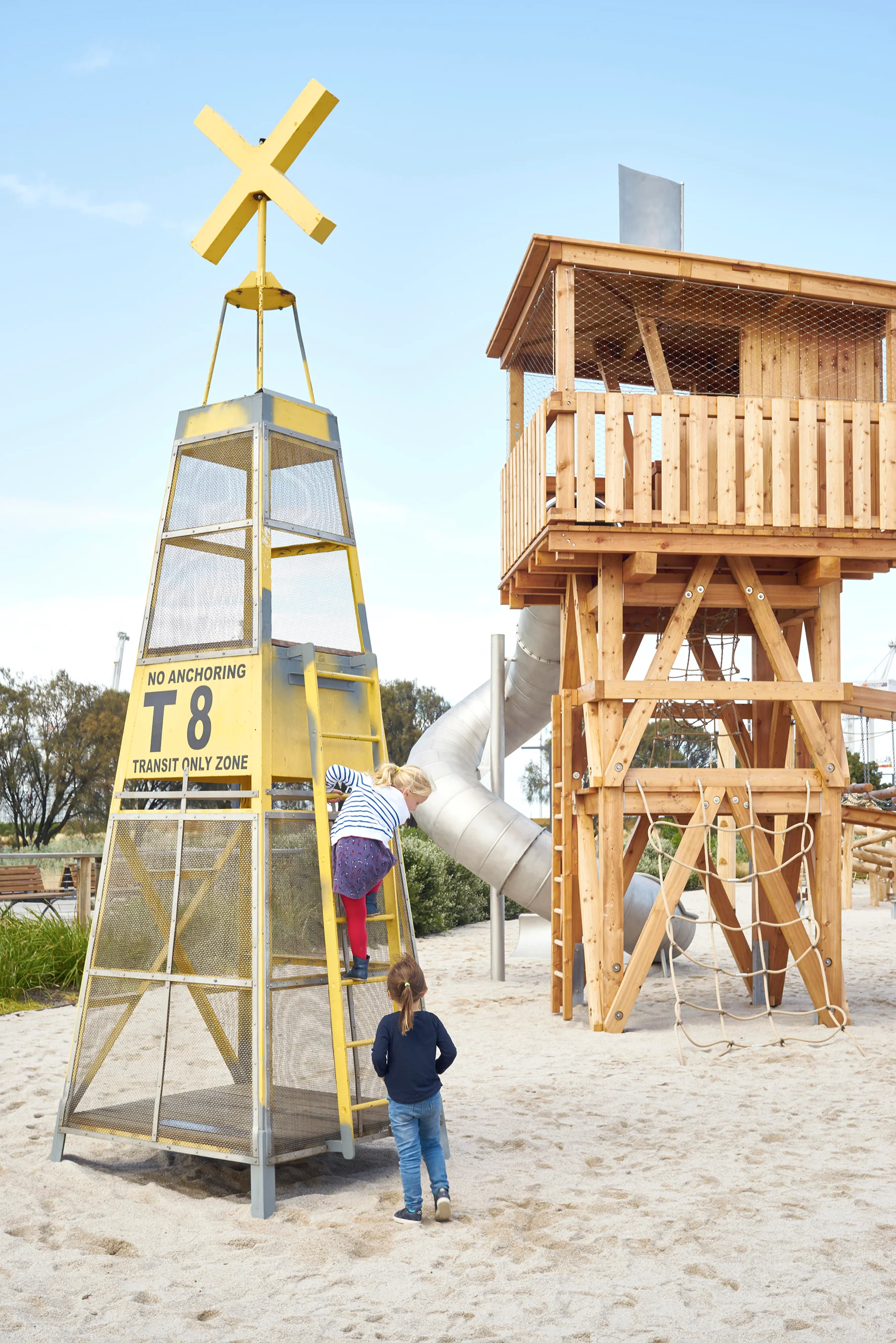 The playspace design is integrated into the dynamic landscape and network of existing timber boardwalks, maximising use while retaining valuable fairy wren habitat. The design enhances the site’s context, with play elements offering views across both the bay and port. It combines decommissioned and re-purposed maritime objects – including mooring buoys and channel markers – capturing the site’s maritime and industrial history.