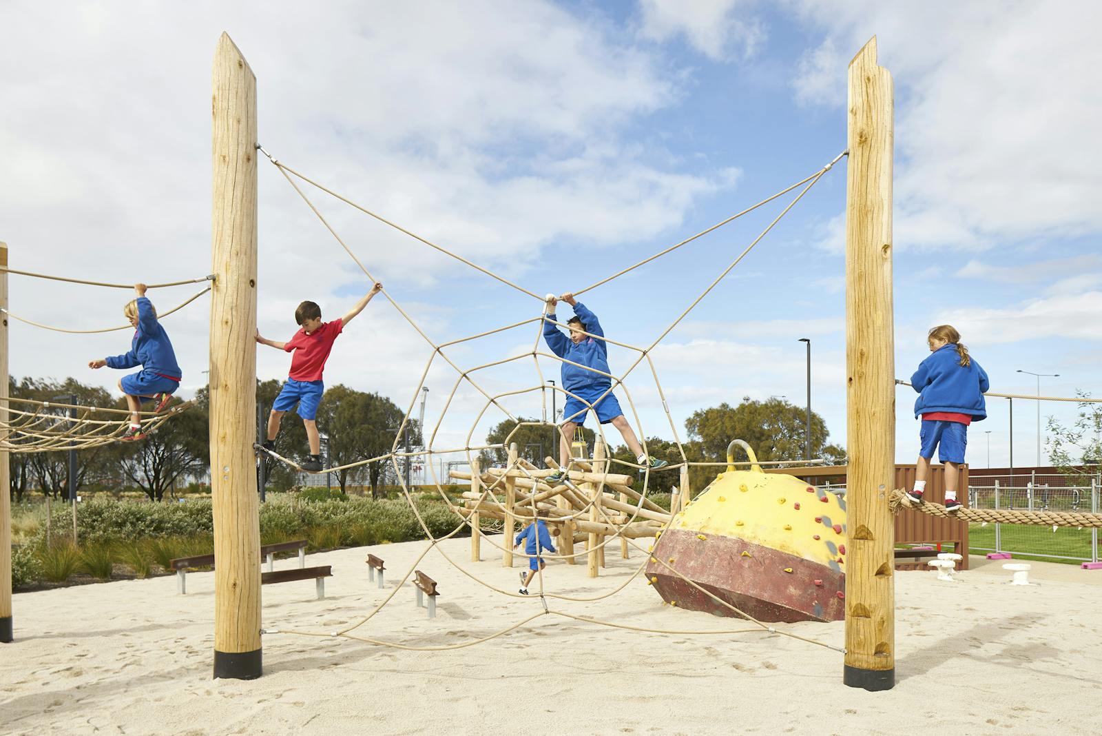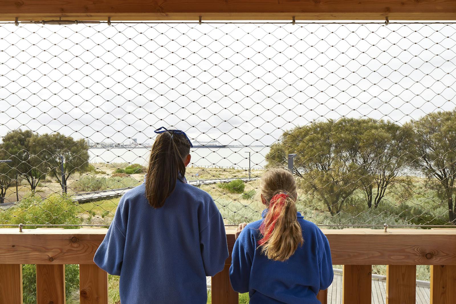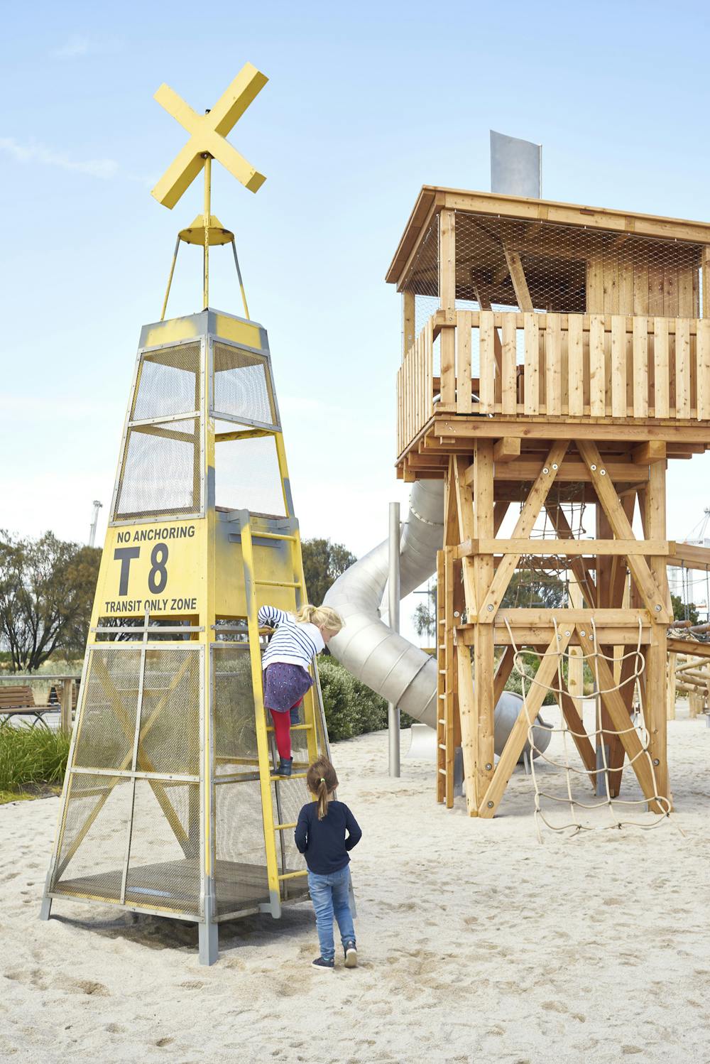 The playspace design is integrated into the dynamic landscape and network of existing timber boardwalks, maximising use while retaining valuable fairy wren habitat. The design enhances the site’s context, with play elements offering views across both the bay and port. It combines decommissioned and re-purposed maritime objects – including mooring buoys and channel markers – capturing the site’s maritime and industrial history.