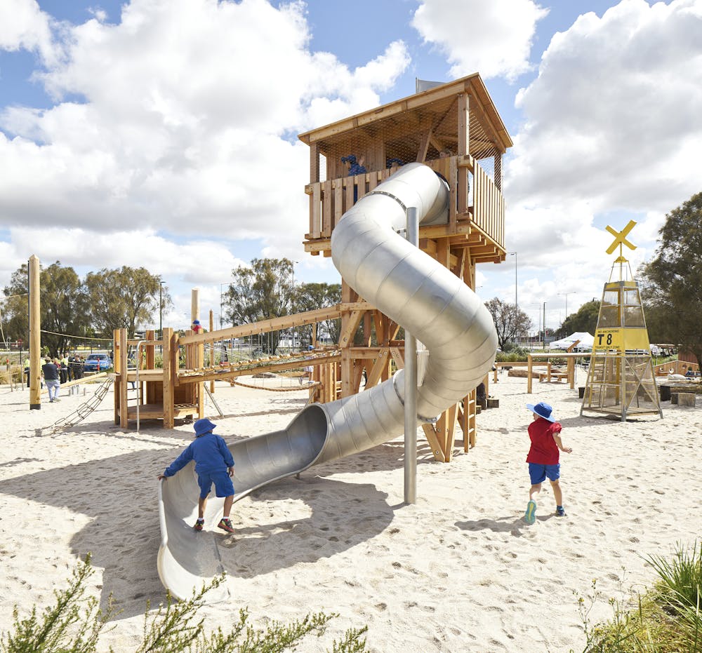 The playspace is curated and gradated – based on risk and interest – from below 3 years of age through to teenagers. The design includes customised and bespoke equipment, engaging the senses with water and sound. Interpretative signage educates the community about the re-purposed equipment.