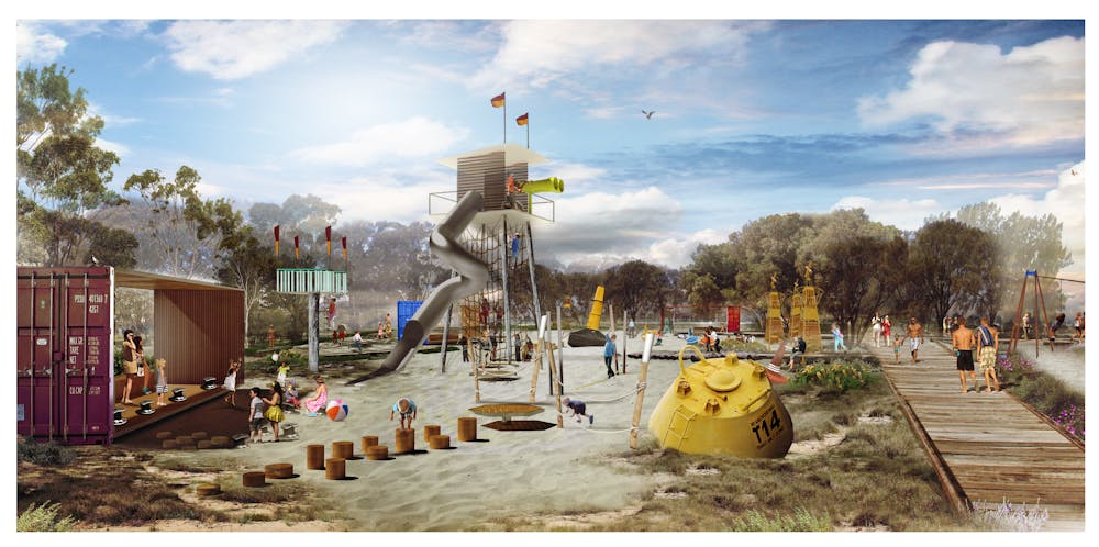 Maritime Cove Playspace is an integrated destinational playspace within the Perc White Reserve, Port Melbourne. OCULUS was engaged by the Port of Melbourne Corporation to create this maritime-themed playspace nestled in the dunal foreshore setting of Port Phillip. The project provided an opportunity to develop a distinctive and bespoke nature-based playspace environment that incorporates a range of activities for children and adults.