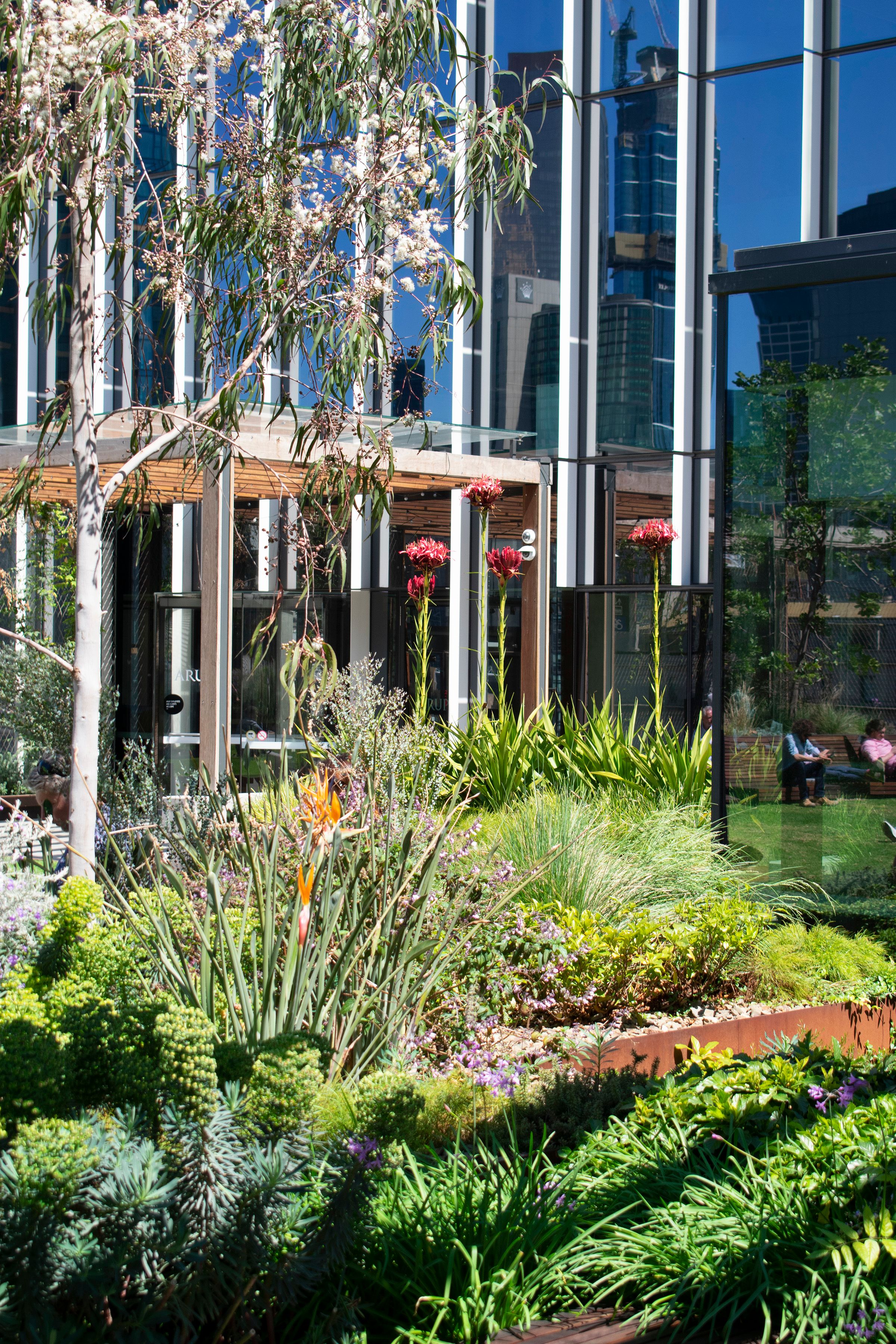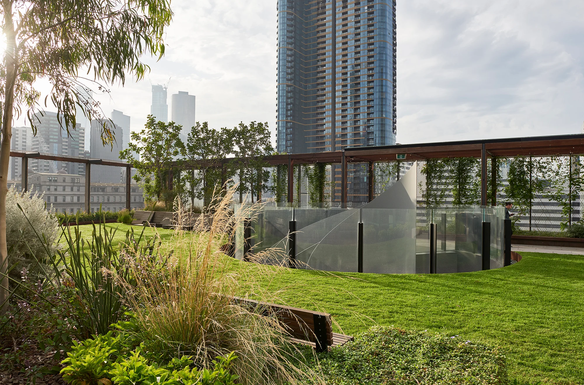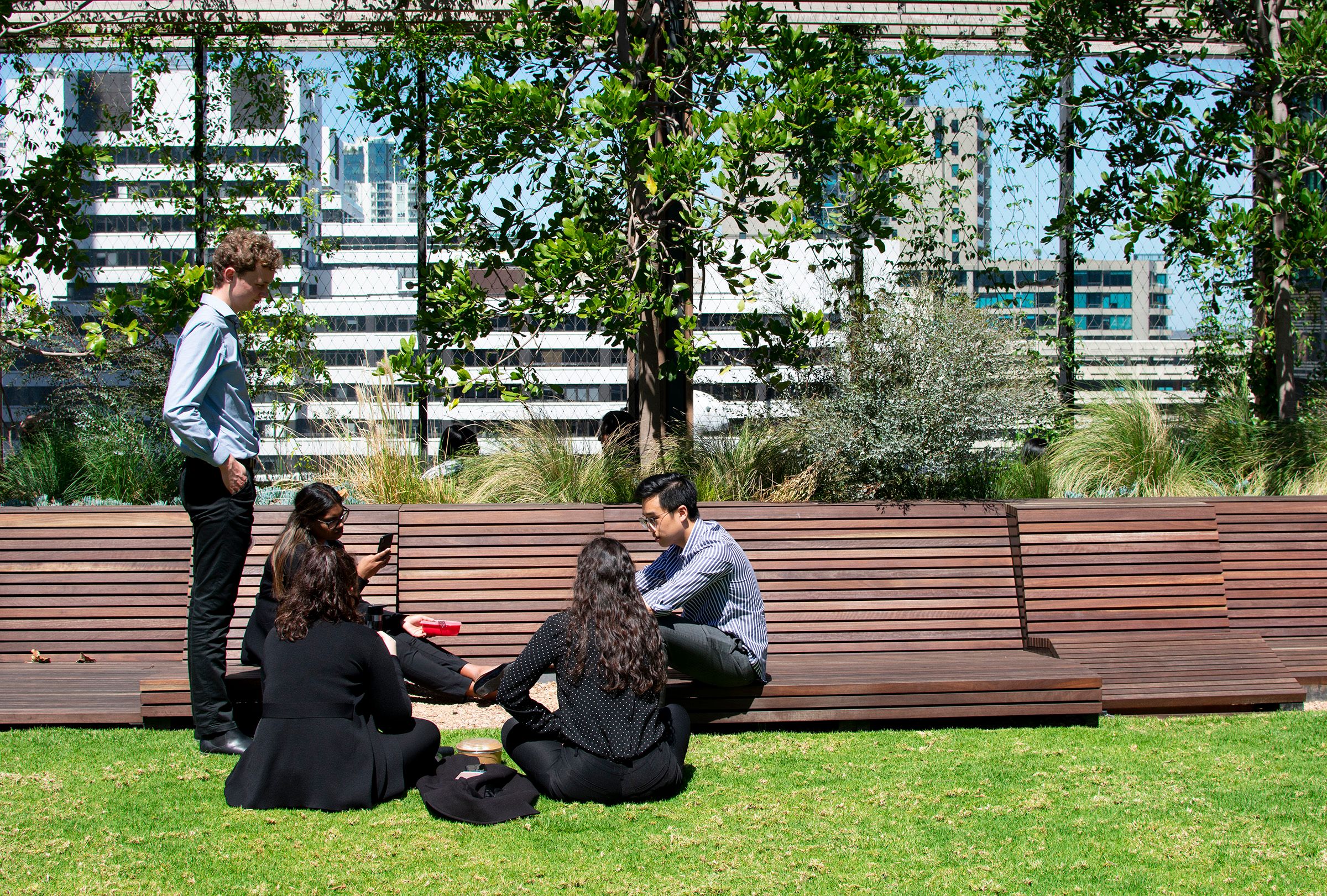 Intimate gardens, raised lawns and central plazas provide balance to the precinct's built form, with a publicly-accessible Sky Park the signature landscape feature – a unique, highly memorable green volume approximately 75-metres long and 30-metres deep. It floats approximately three-storeys above Collins Street's public realm, creating a major open space amenity. The Sky Park first opened in 2018, was expanded in 2024, and is the first of its kind in Melbourne.