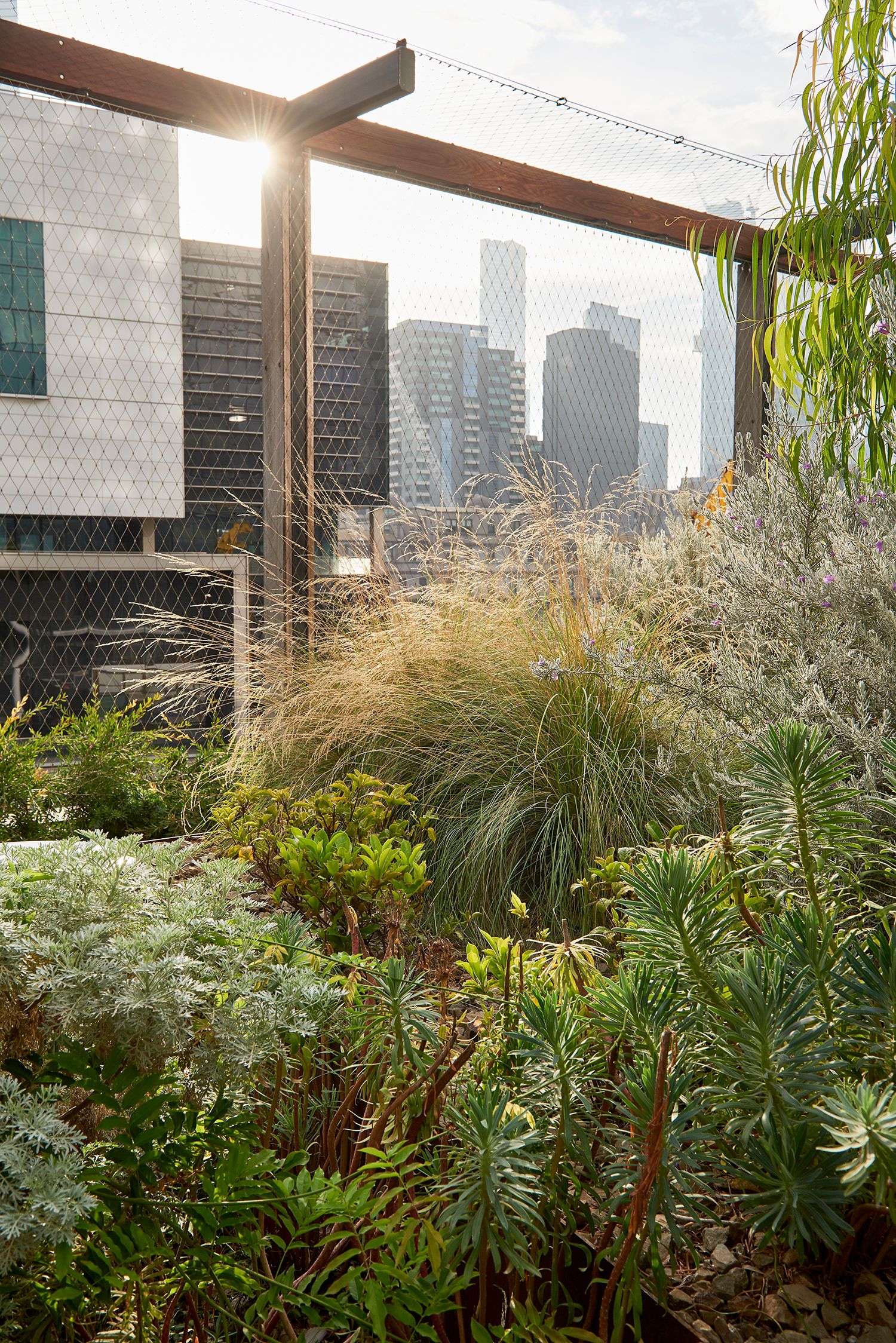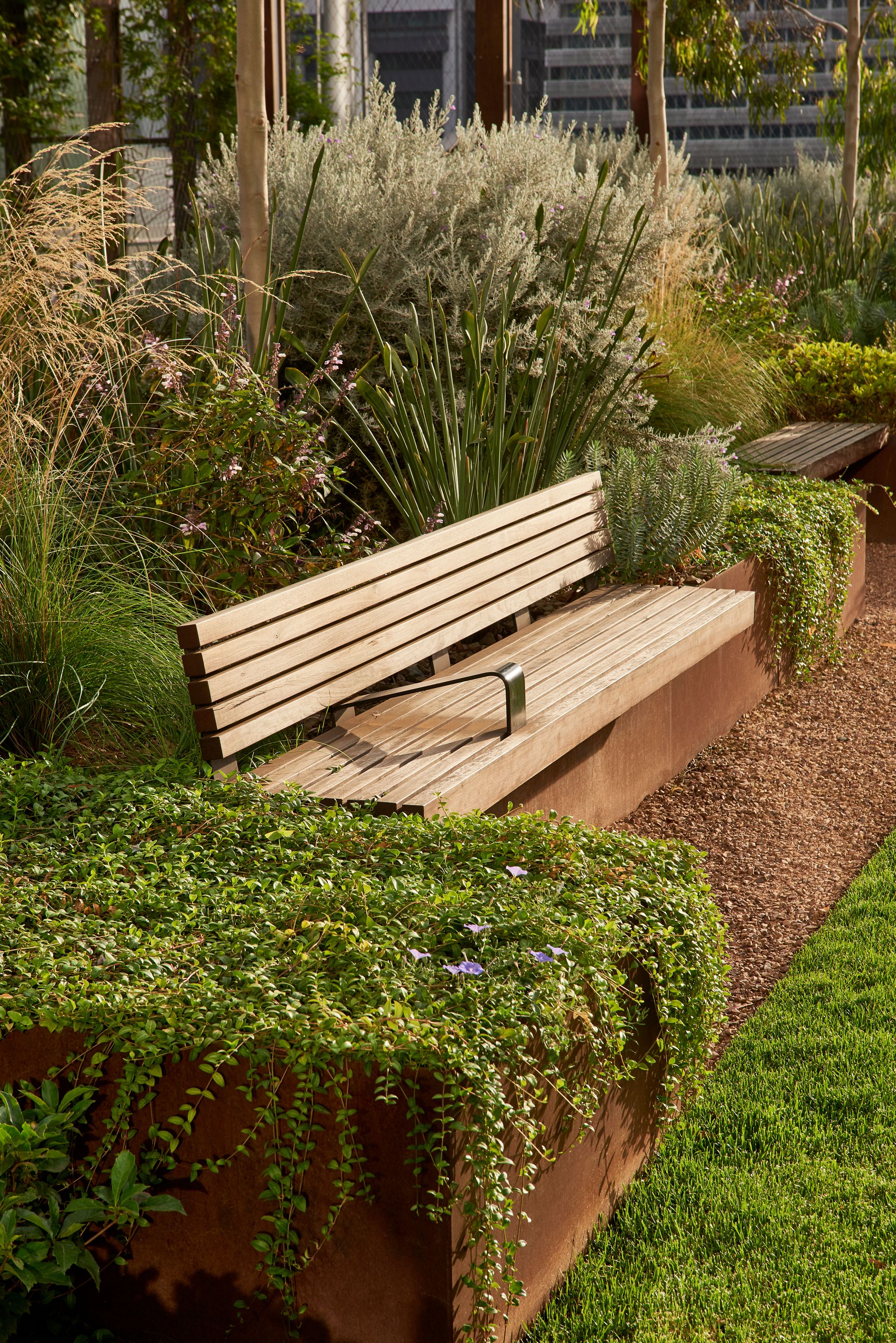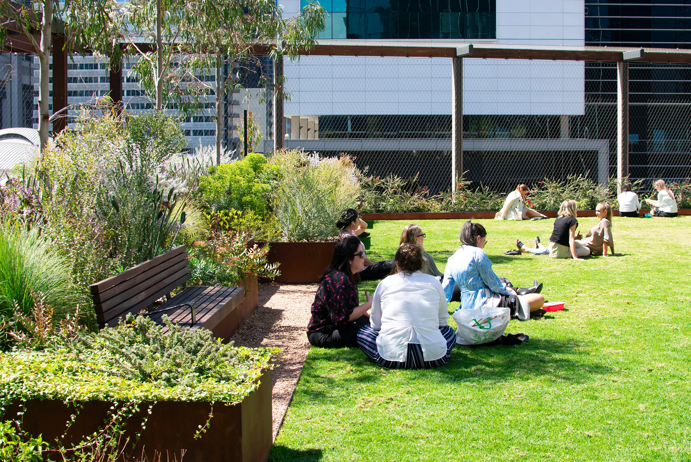 Intimate gardens, raised lawns and central plazas provide balance to the precinct's built form, with a publicly-accessible Sky Park the signature landscape feature – a unique, highly memorable green volume approximately 75-metres long and 30-metres deep. It floats approximately three-storeys above Collins Street's public realm, creating a major open space amenity. The Sky Park first opened in 2018, was expanded in 2024, and is the first of its kind in Melbourne.