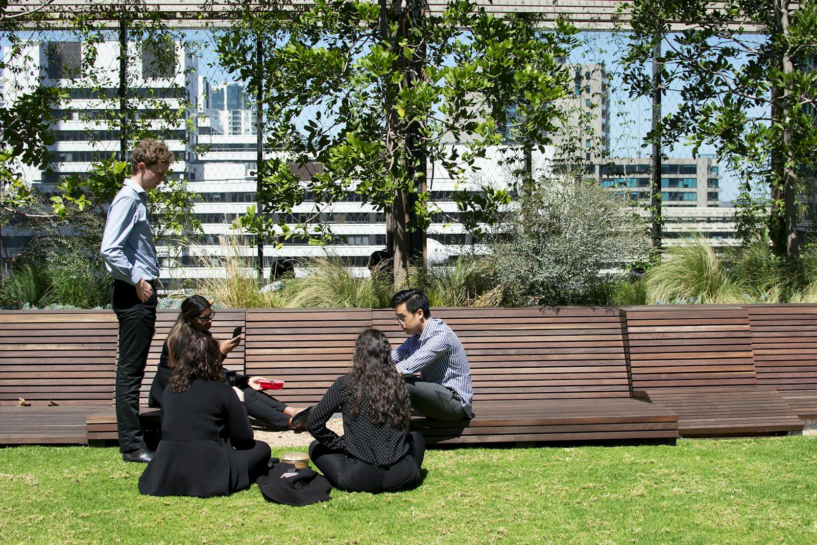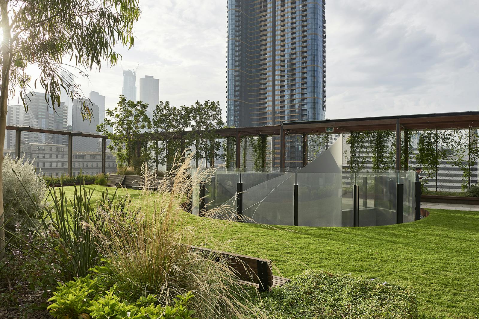 Intimate gardens, raised lawns and central plazas provide balance to the precinct's built form, with a publicly-accessible Sky Park the signature landscape feature – a unique, highly memorable green volume approximately 75-metres long and 30-metres deep. It floats approximately three-storeys above Collins Street's public realm, creating a major open space amenity. The Sky Park first opened in 2018, was expanded in 2024, and is the first of its kind in Melbourne.