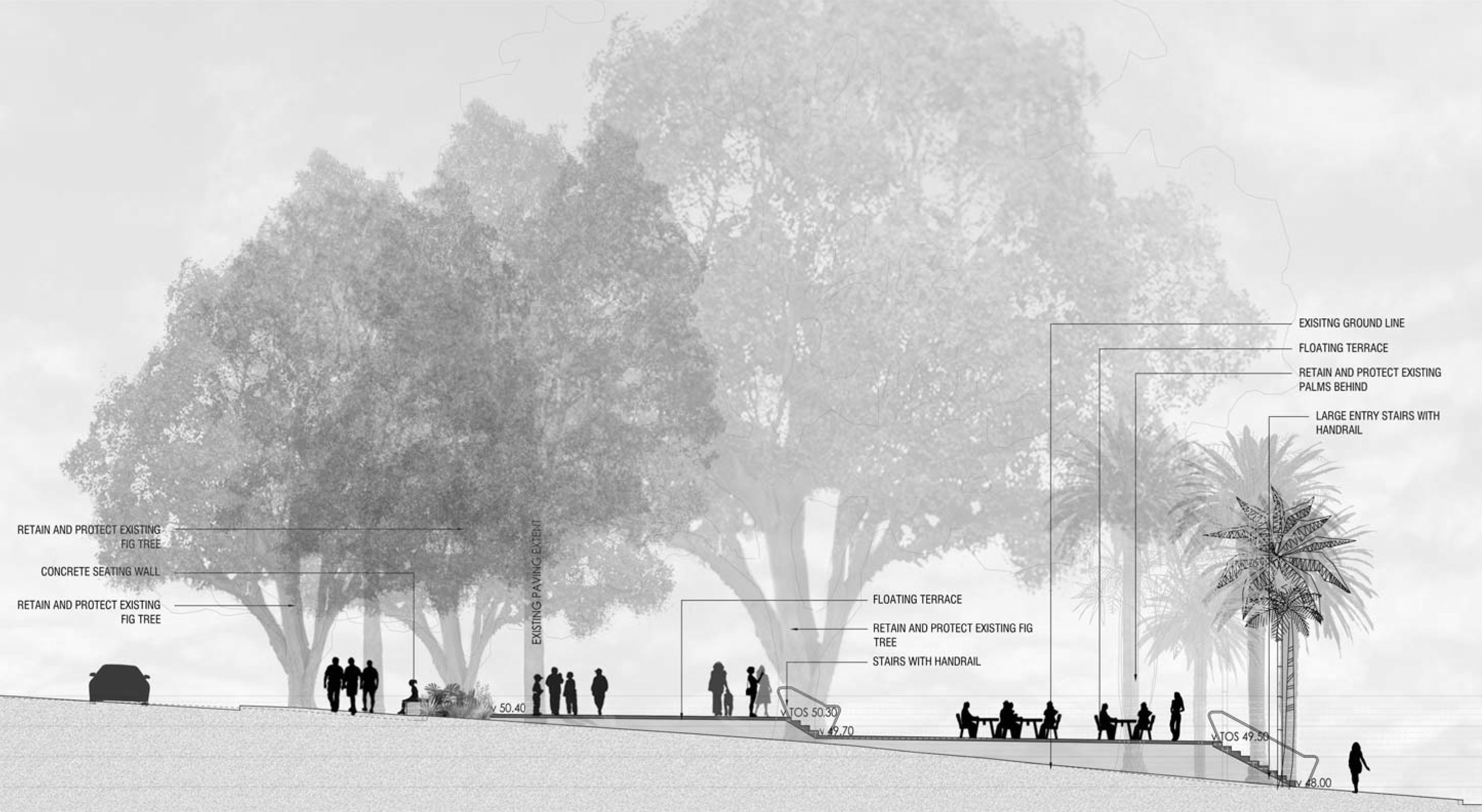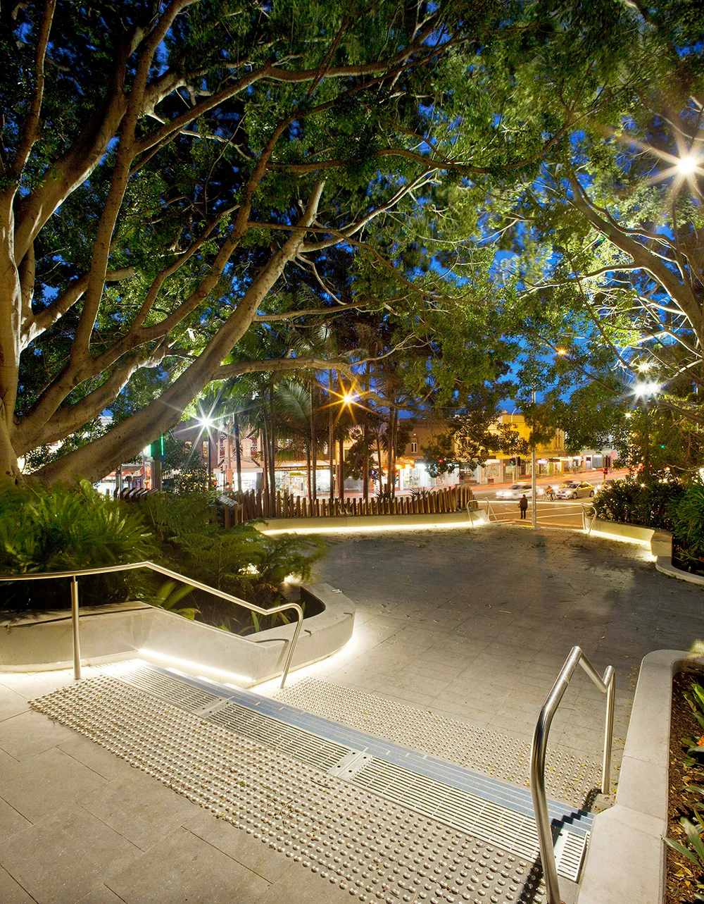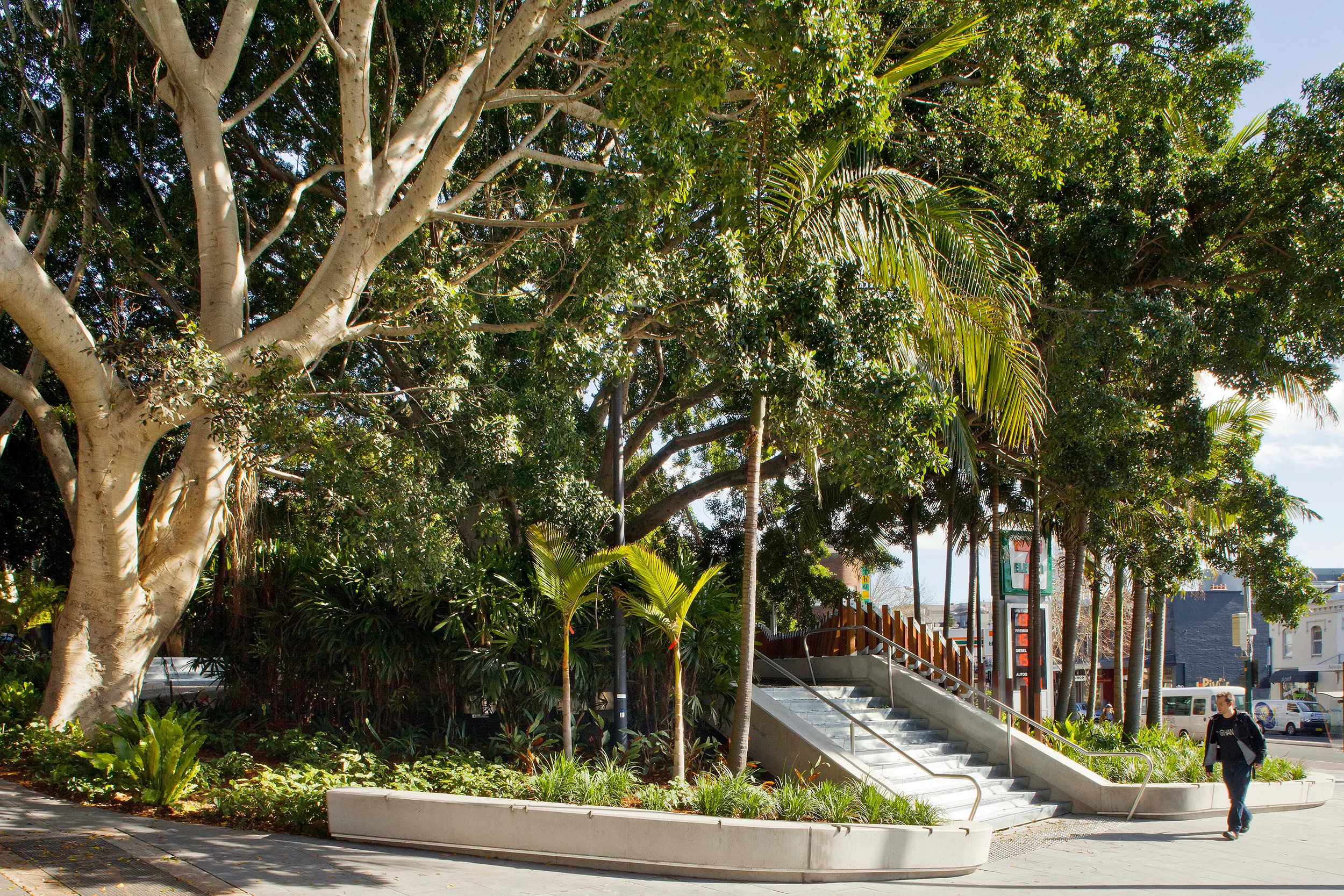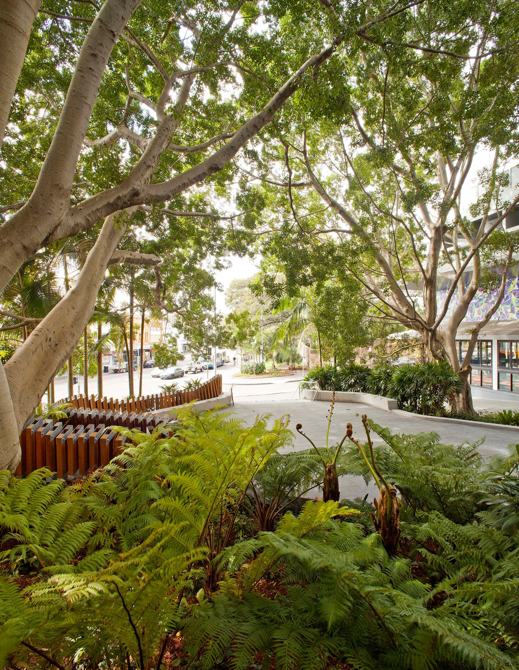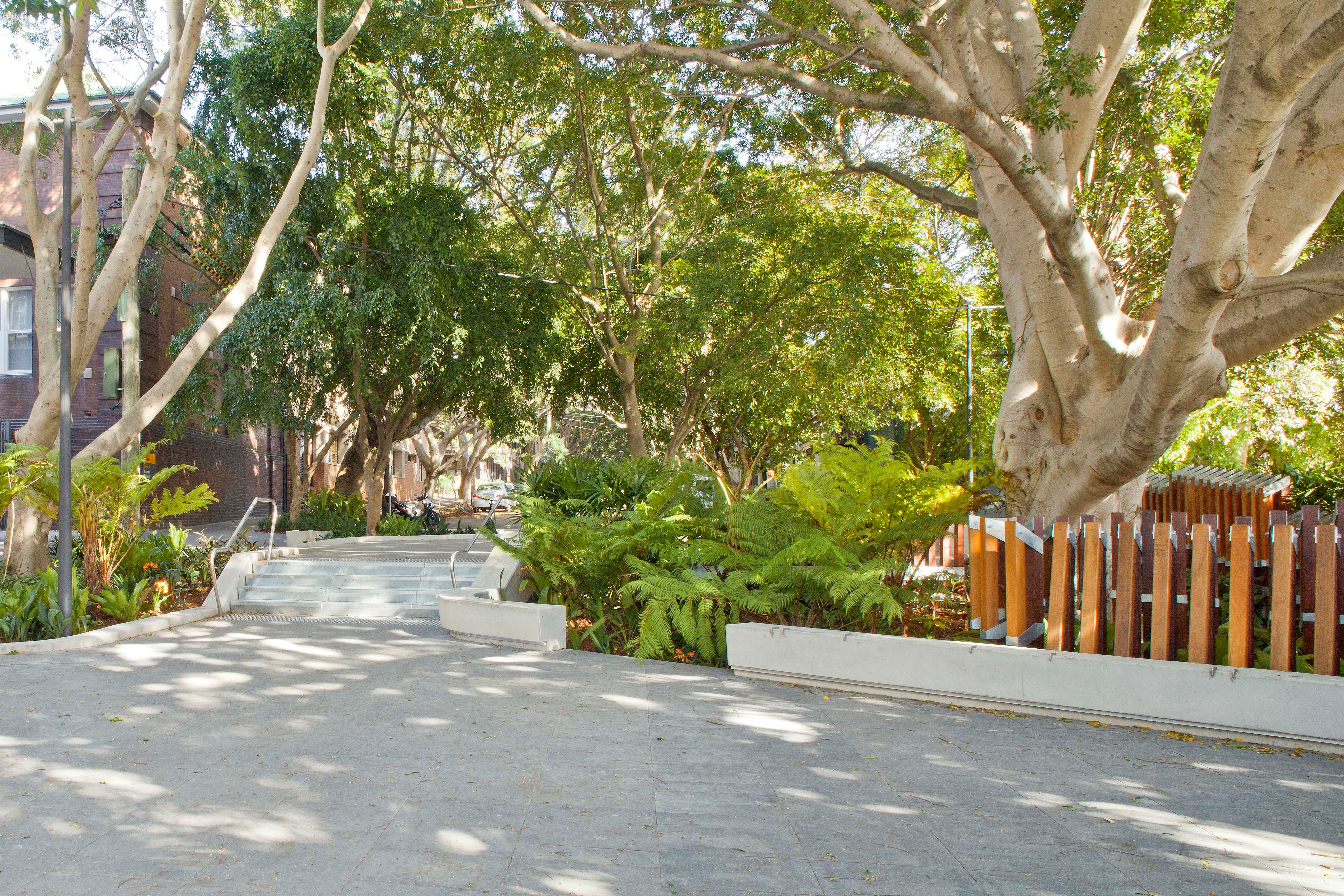 The defining aspect of the space was and continues to be the tree canopy, comprised principally of fig trees (Ficus macrocarpa hillii & Ficus benjamina) and bangalow palms (Archontophoenix cunninghamiana). All the trees on site were retained and supplemented with dense planting that complements the curvilinear form of the seating walls and existing trees.