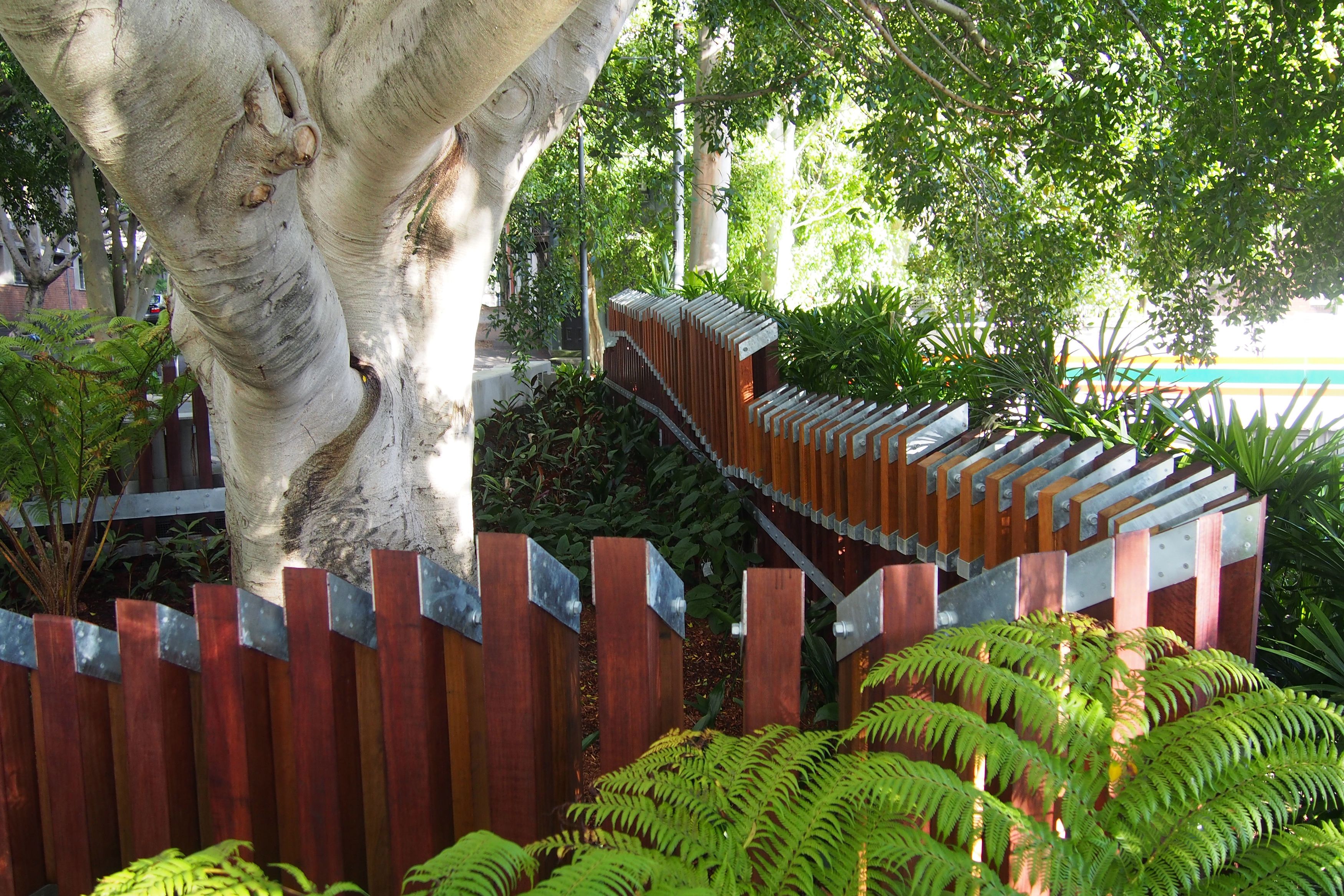 The park's structure creates a series of rooms enclosed by the impressive tree canopy. The inclusion of the two decks allows direct movement through the site while providing three clear zones of occupation, which can be inhabited by COFA staff, students and visitors as well as the local community.