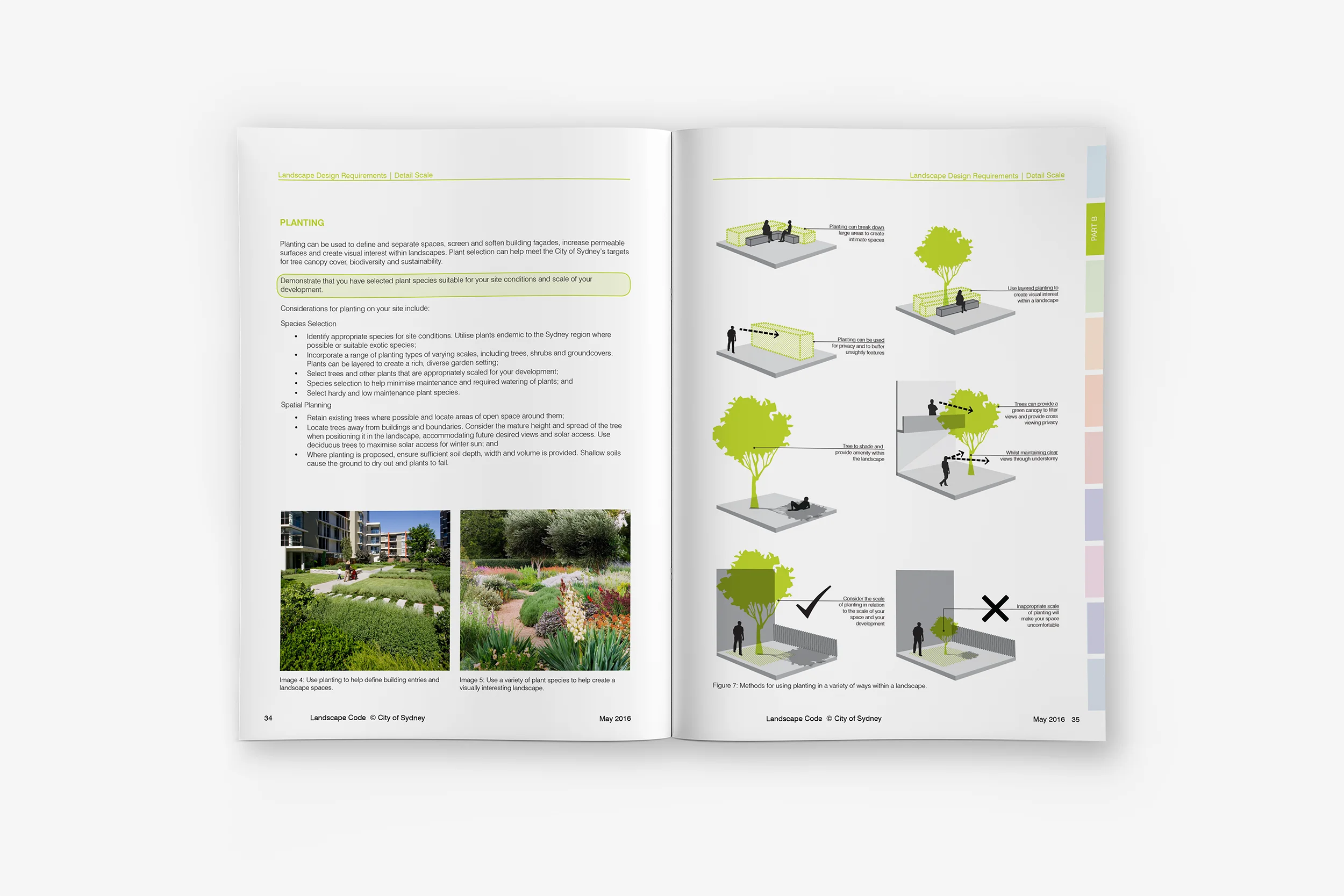 OCULUS prepared the Sydney Landscape Code to guide the creation of high quality, sustainable landscape spaces within private developments across the City of Sydney. The Landscape Code provides practical advice and guidelines to assist landowners to contribute to the greening of the City. It specifies Council requirements for the preparation of landscape plans for Development Application submissions.