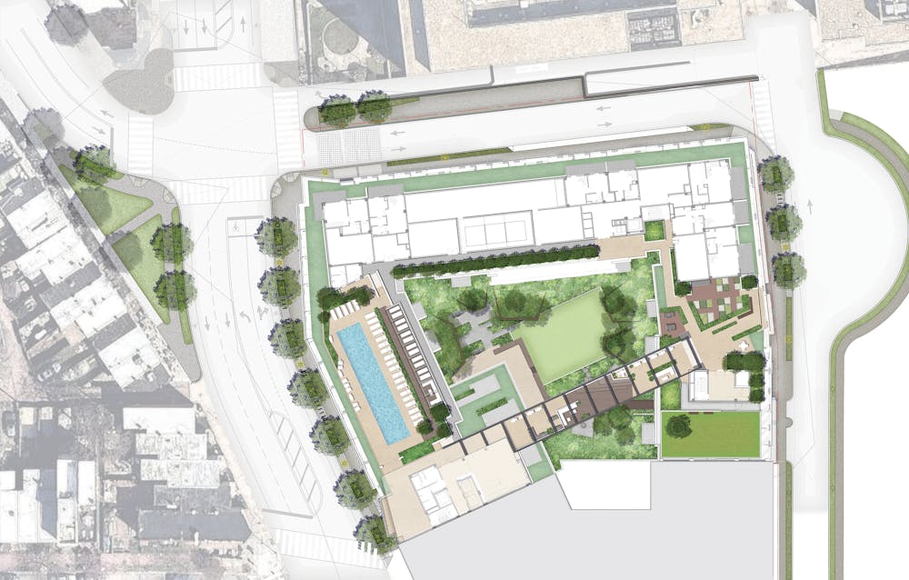 Anchored by a Whole Foods grocery store, this mixed-use development project consists of streetscapes, a rooftop courtyard, and a penthouse-level amenity terrace designed by OCULUS. At the ground level, street trees and permeable paving replace a treeless parking lot while an awkward intersection has been made hospitable with the creation of a public pocket park.