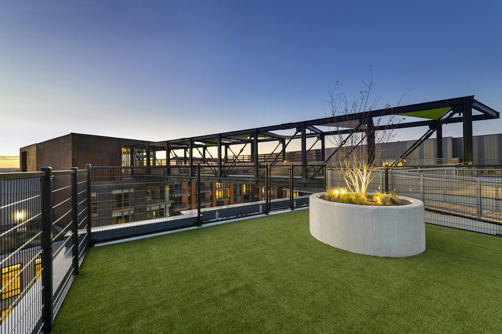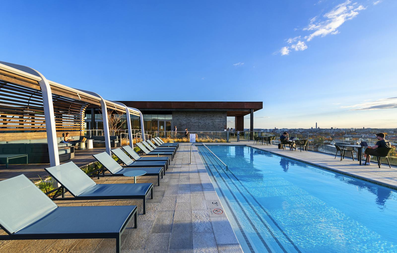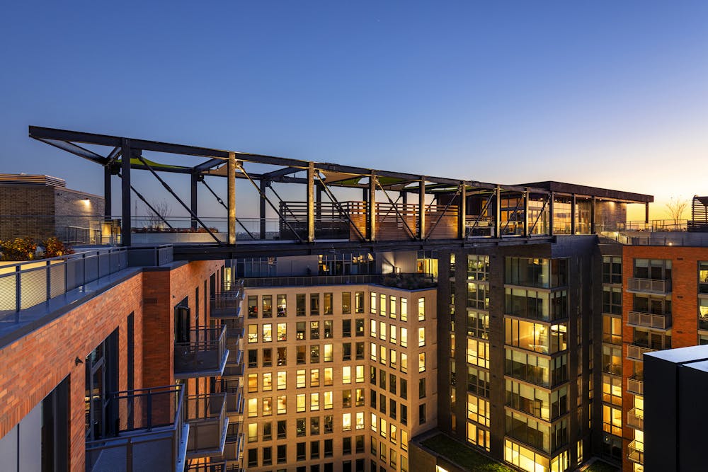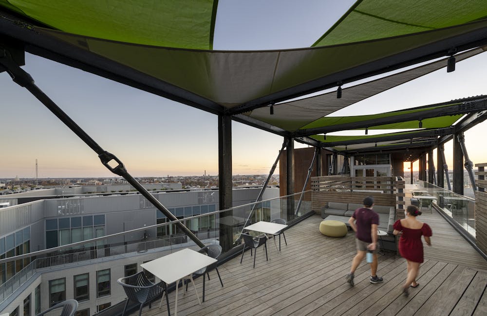 Lofted some 130-feet above the ground and spanning the width of the courtyard, an open-air skybridge serves as a pedestrian corridor and amenity space. With panoramic views of the District, it includes stadium-style seating, grills, and moveable furnishings. The rooftop comprises a pool, a shaded terrace structure, a pet spa and exercise area, and vegetable gardens for use by the residents. The design includes some 22,000 square feet of vegetated roofs, a solar array, and stormwater collection facilities.