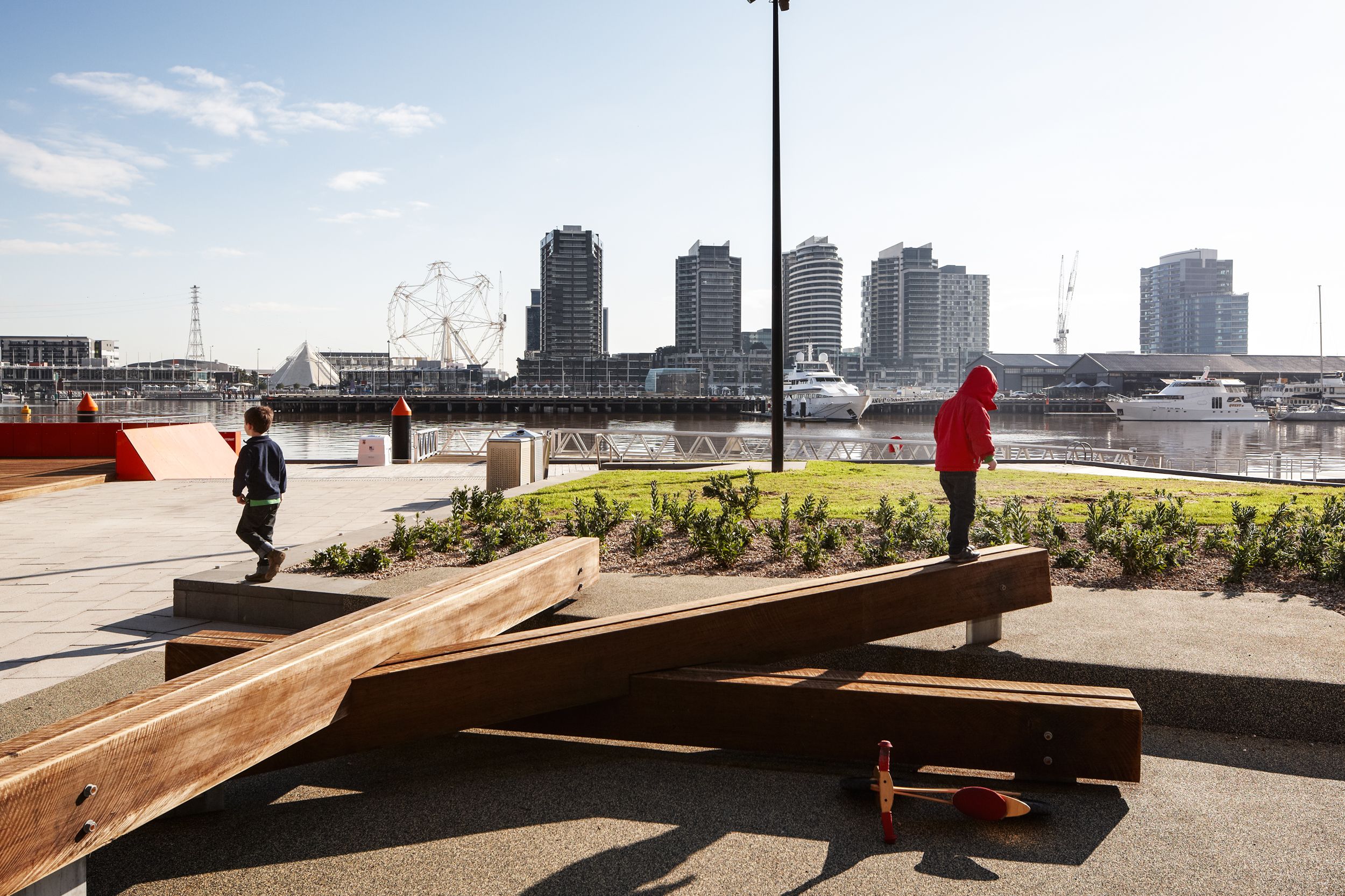 A number of significant projects were delivered as part of the masterplan, including: major streets and laneways; a tram super stop; bike lanes; a waterside promenade and marine wharves; Buluk Park (a major new wifi-enabled public open space); two innovative wet and dry play spaces; integrated public art; internal private courtyards, podium planting and green roofs; a temporary activation park; and running track, basketball court and dog-park.